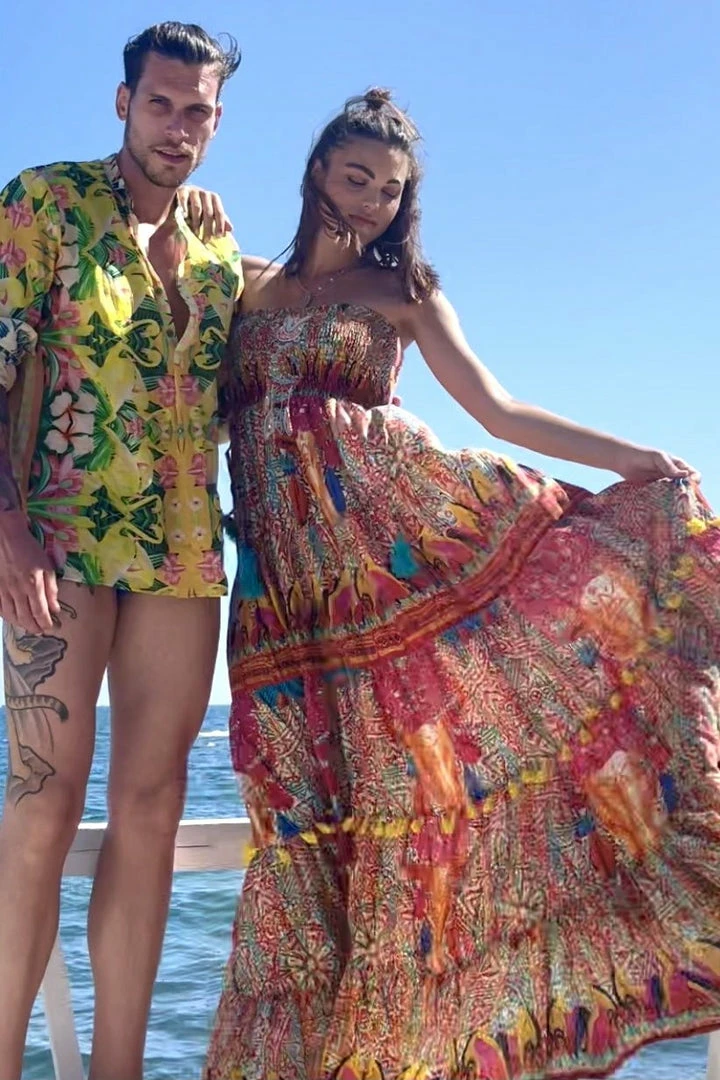 Long dress with suspenders by Antica Sartoria Positano by Giacomo Cinque. Made of soft cotton with a boho-themed print. Elastic bodice. Flounced bottom embellished with small colored tassels.
