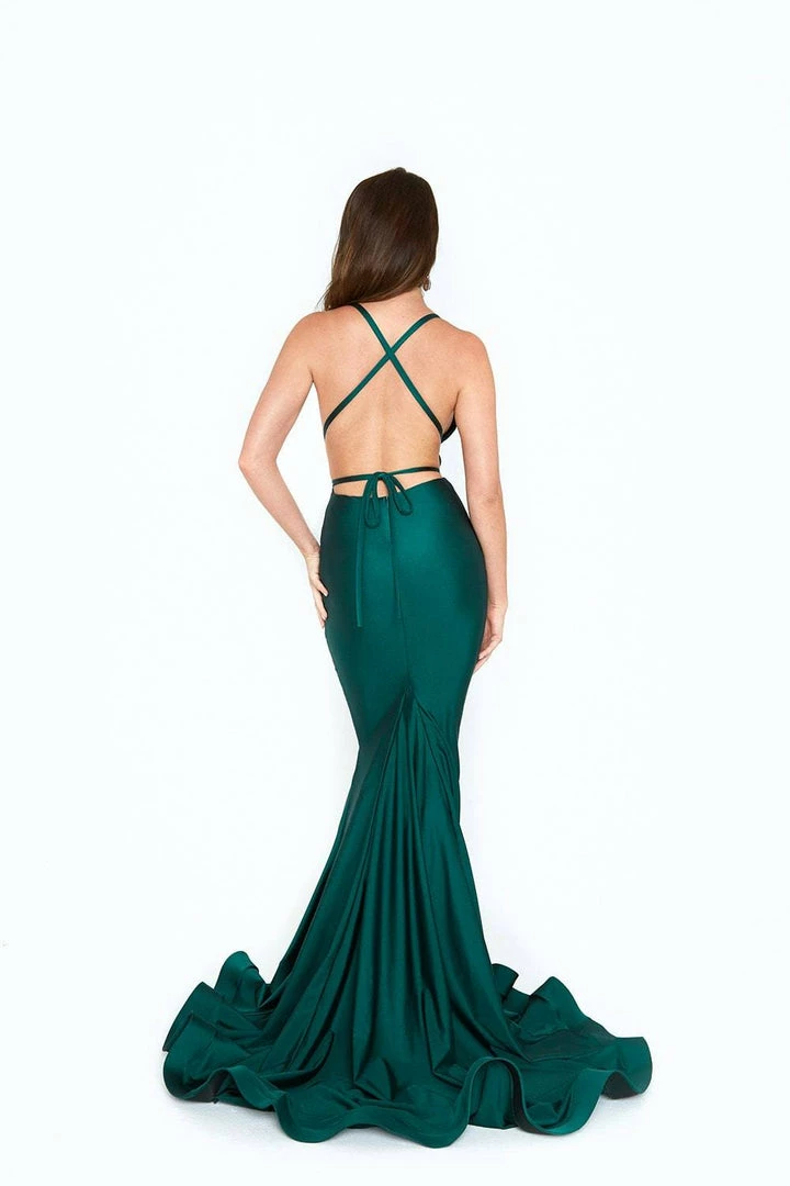 A classic fitted silhouette with a halter v neckline and beautiful lace up back. The straps wrap around the top of the neck and down around the waist to provide a great fit and easy adjustments to the top.