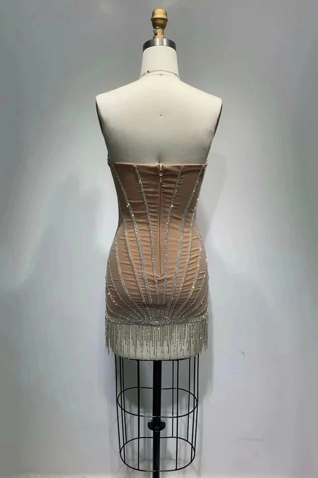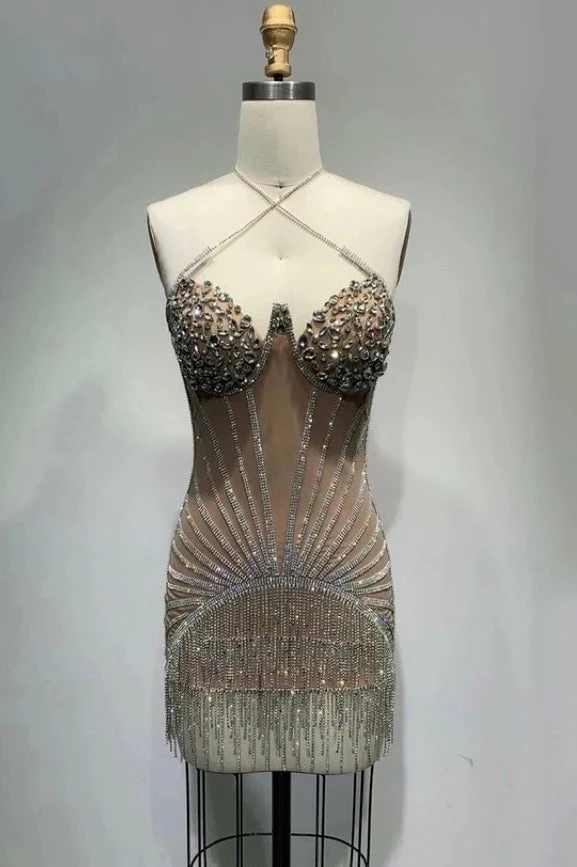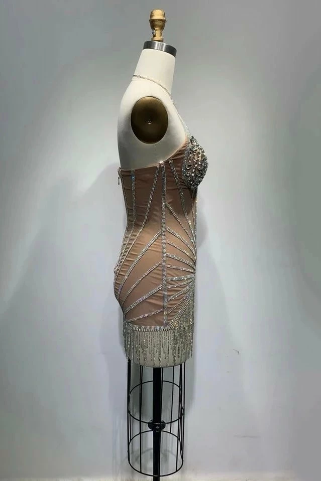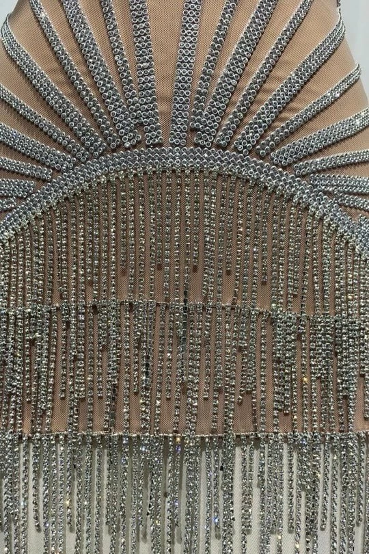 Own the night in our “Alpha 2” mini dress! Featuring a fully dazzled mini dress with a cross halter neck, mesh liner, rhinestone v neck cups, and a crystal fringe skirt hem. Pair with stilettos and a sparkly clutch for a night to remember!