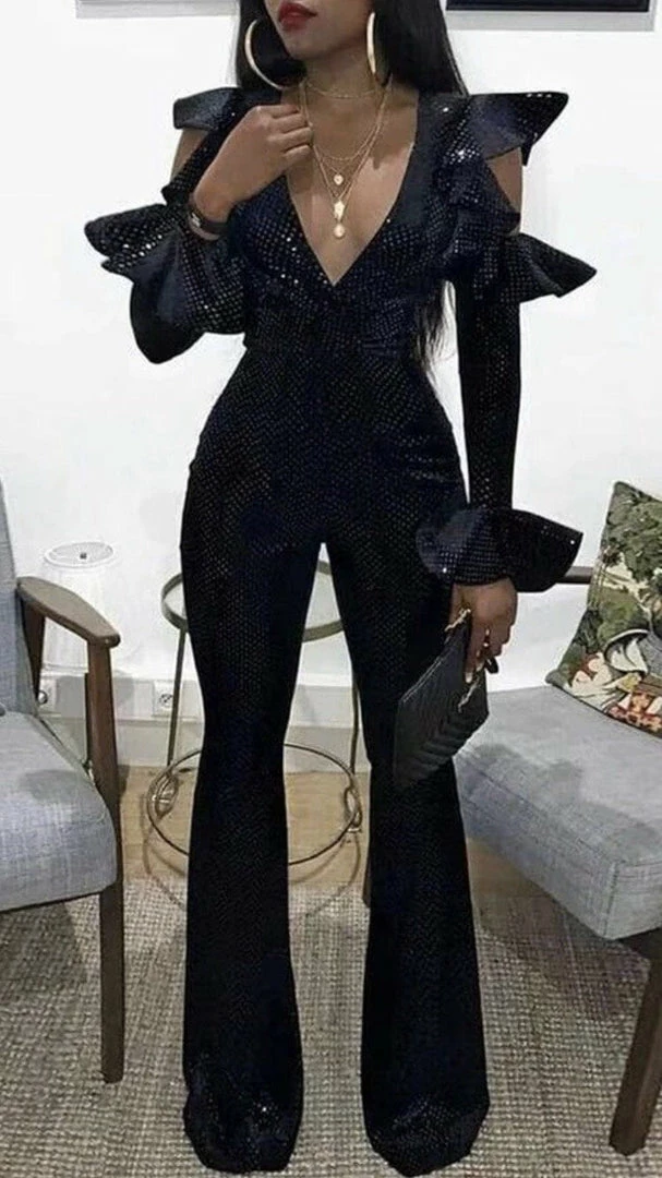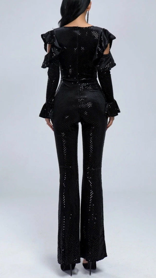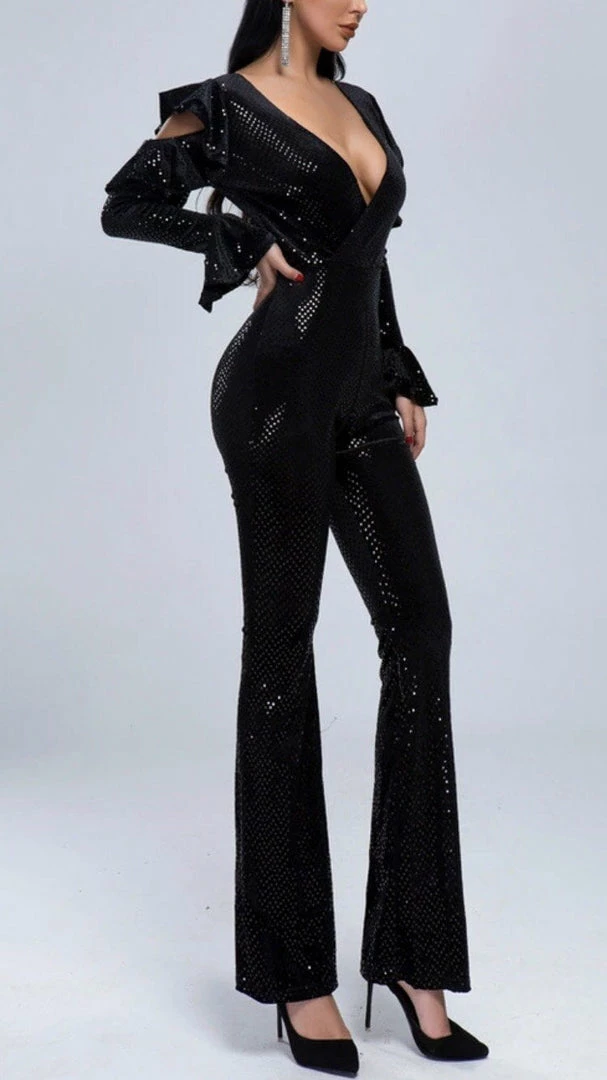 Obsessed with sequins? So are we! Our ‘Alison’ jumpsuit features sequins all over, long sleeves, cold-shoulder and flare sleeves, and a v-neck detail. Pair with silver accessories!