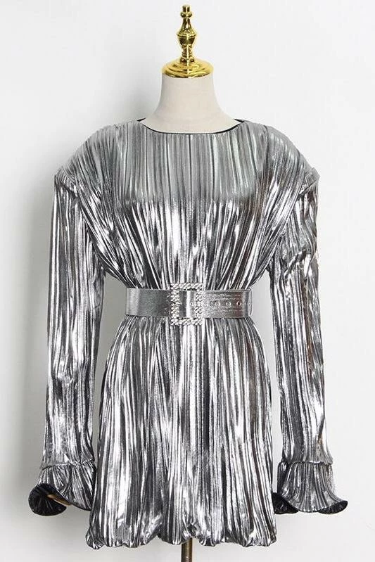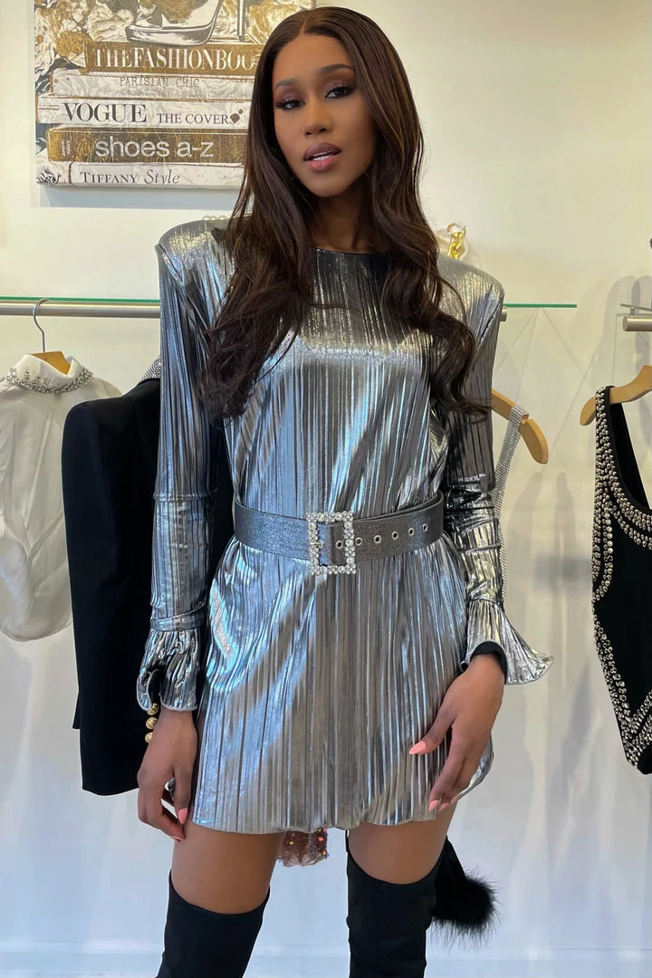 Look totally chic this holiday season! Featuring a long sleeves with a flared, curled cuff, a metallic fabric, and a crystal belt. Pair with booties and a small handbag to celebrate in style this season!