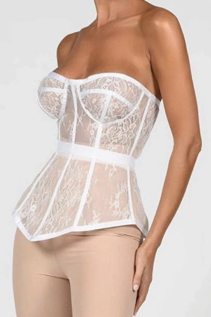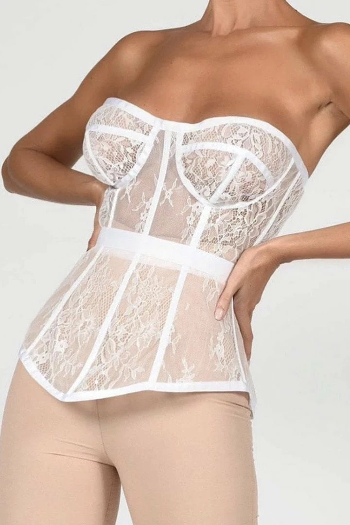 This gorgeous piece is a must have this season dolls! Featuring a strapless fit, lace material, bustier style, and sheer details. Pair on its own with light wash denim or over a dress for such a fun look!