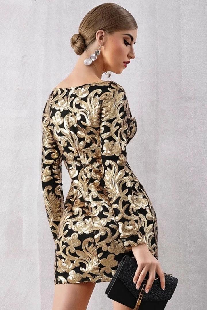 Get ready to own the night in our ‘Elana’ mini! Featuring a black material with gold details, sweat heart neckline, long sleeves, bodycon fit, and a mini length. Pair with black stilettos and statement earrings.