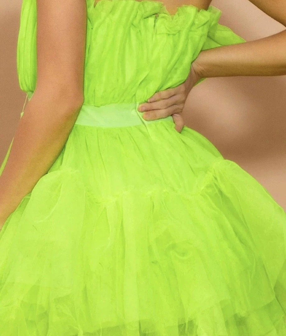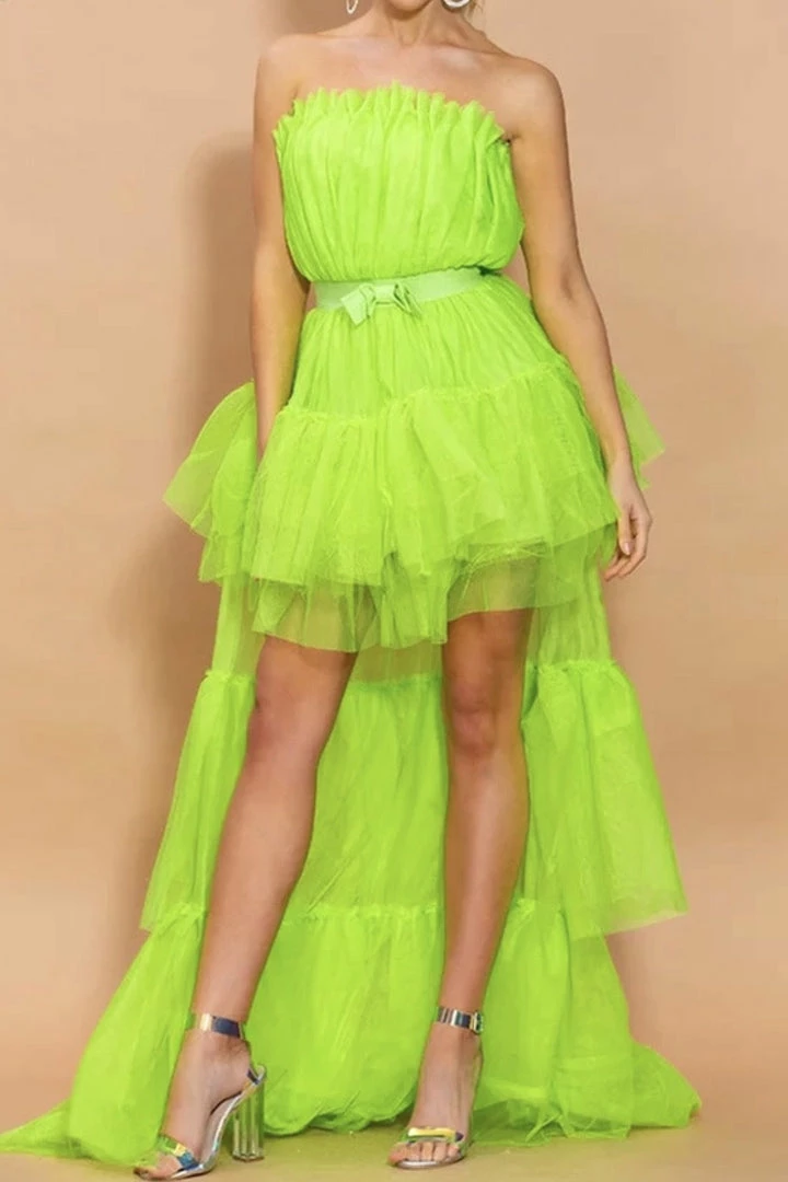 The perfect dress to stand out on any occasion. Featuring a tulle material, strapless style, high low length, and belted waist. Pair with stilettos and statement earrings!