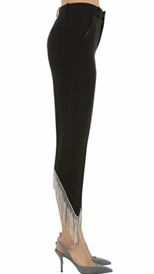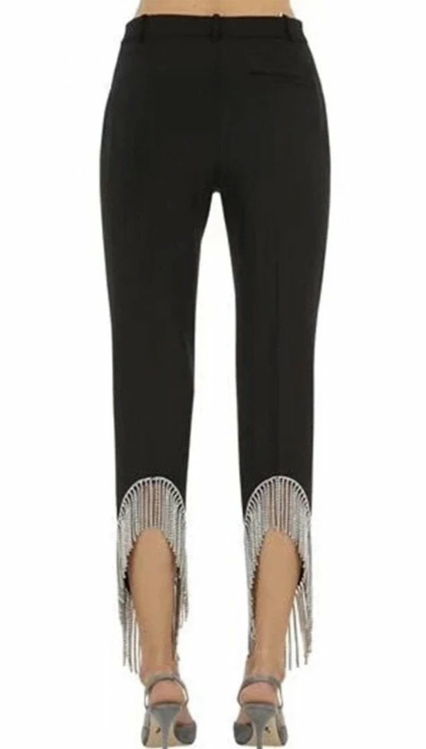 These gorgeous pants are so on trend. Featuring high-waisted fit, ankle length, and diamond tassels along the hem.
