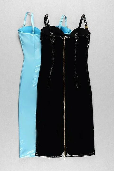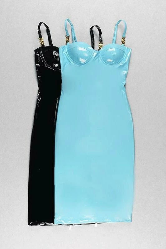 Look lavish in latex with this fitted midi! Featuring a bustier outline, thin straps with gold linked detailing, a pleather material, and a midi length. Style with a sliked back pony and fierce pumps for a killer look.