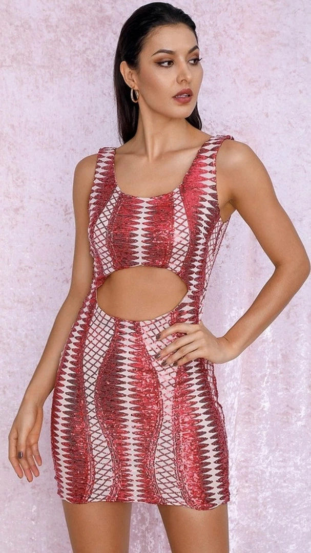 This fierce figure-hugging dress is perfect for your next party. Including a geometric pattern of sequins, a mini length, and a cut out around the waist. Team this with strappy heels and a fun clutch.