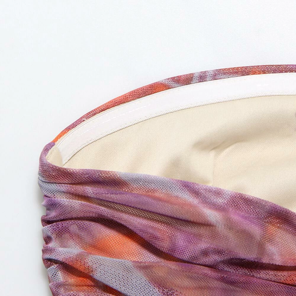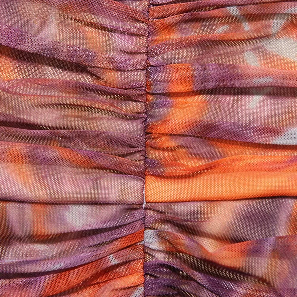 Funky patterns are a must this season. This midi features a multi colored tie dye design, a ruched style, and strapless. Pair with a colored ankle strap heel and a mini shoulder bag for a hot look to the bar.