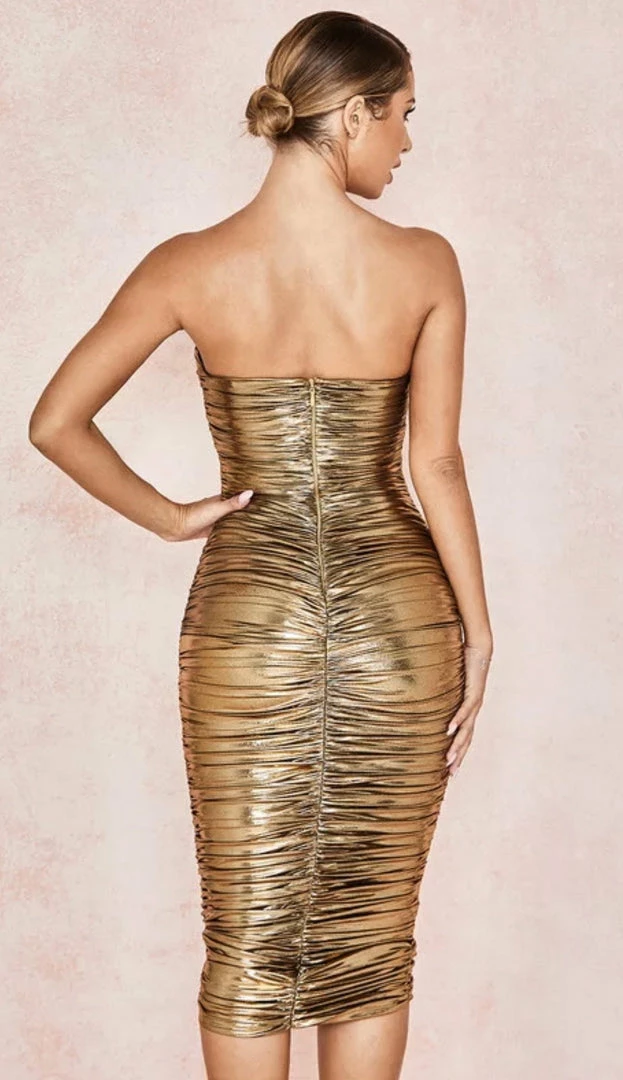 Give your look a seriously chic update with this midi dress. Featuring a gold metallic material with ruched detailing and a midi length. Style this with barely-there heels for a night out with the dolls!