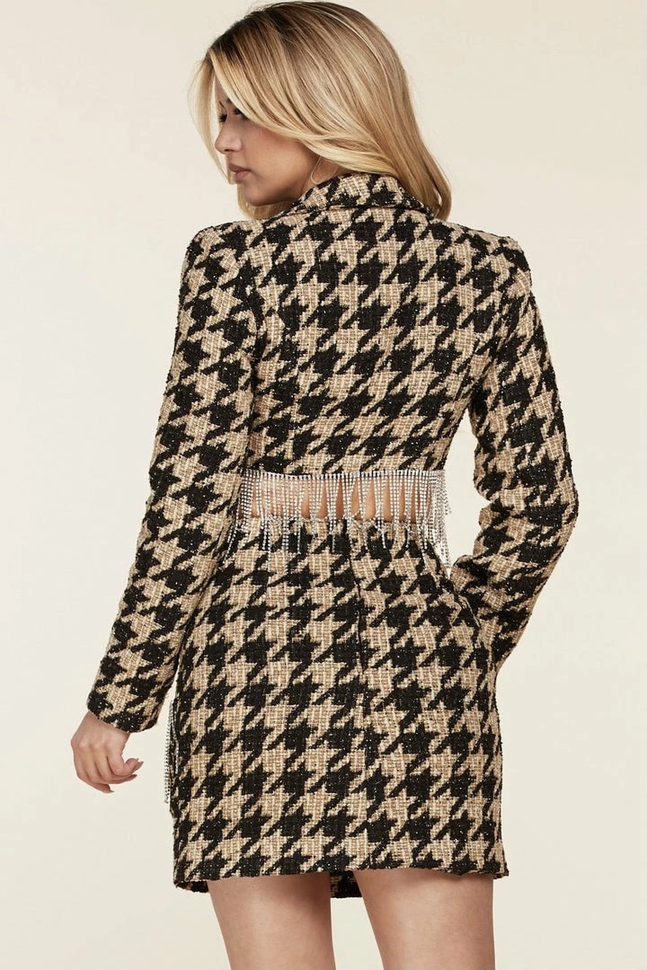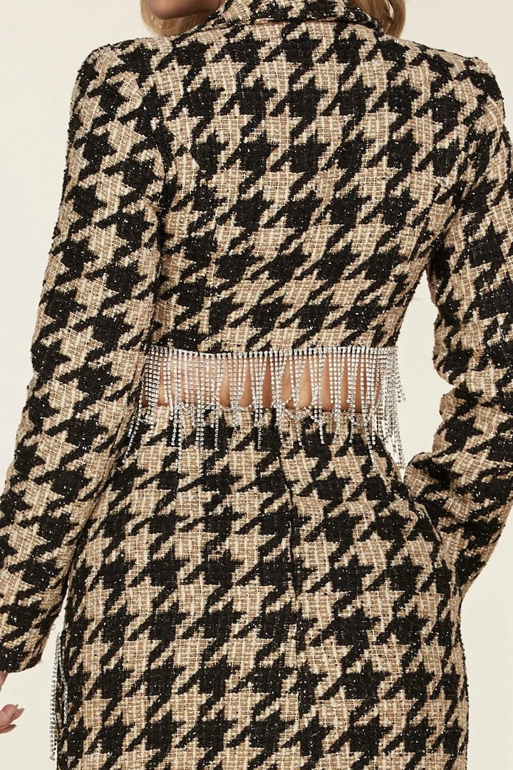 Gorgeous two piece cropped blazer and mini skirt set in taupe & black houndstooth print. Turns heads with its rhinestone tassel fringe along the hem of the blazer and the patch pockets on the skirt. Blazer closes with a large gold tone hook-and-eye in the front, adding another charming detail to the set.