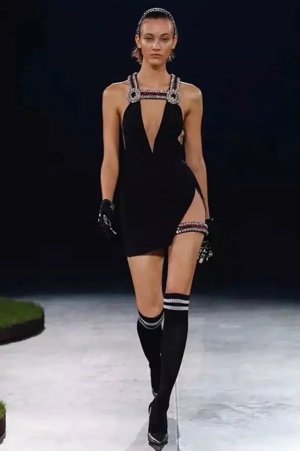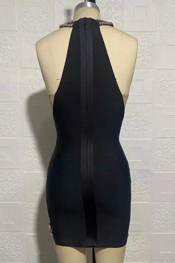 Step on the scene stylish! This mini features a bandage material, crystal straps, a sultry leg slit, and plunging neckline. Style with black pumps and a slick back pony for a jaw-dropping look.
