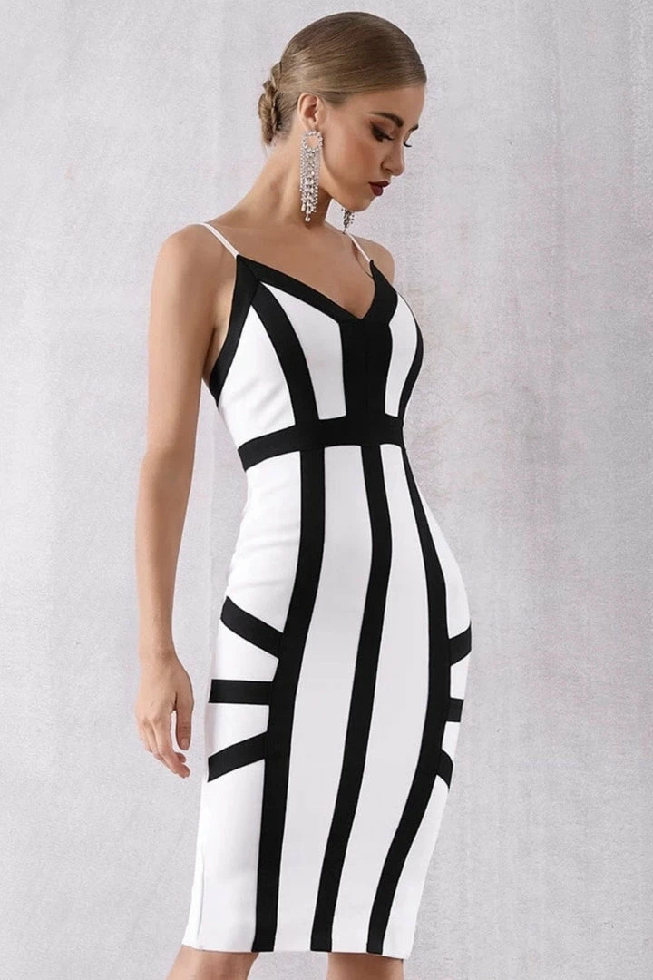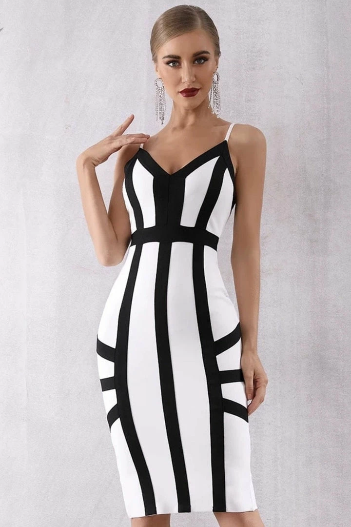 Be spot on trend with this contrast midi! Featuring a black and white material, spaghetti straps, bodycon fit, and a slit on the back. Pair with black strappy heels!