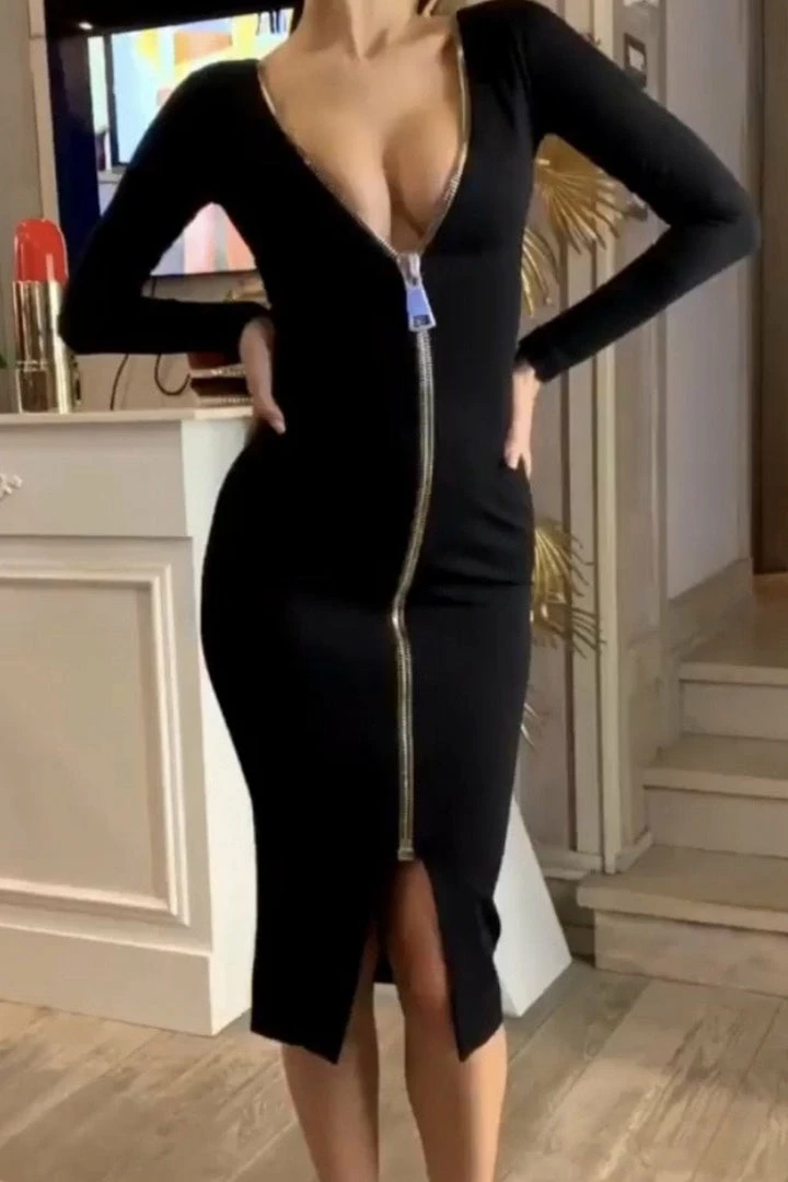 Look ultra sexy in this jaw-dropping midi dress! Featuring a reversible dress with long sleeves, knit material, exposed zipper detailing, and midi length. Pair with stilettos and a mini handbag!