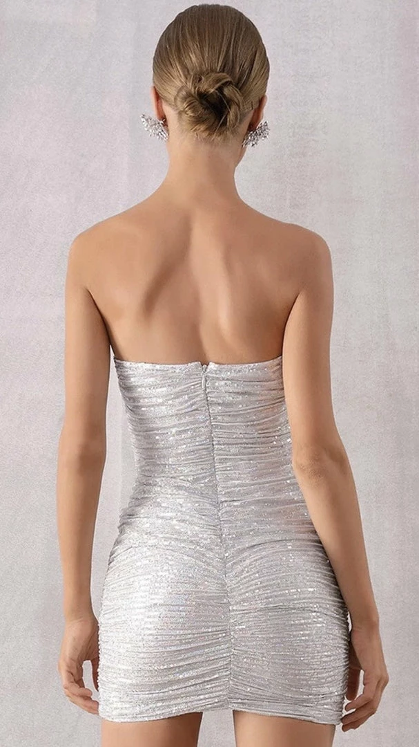 We are obsessing over all things glitzy for the upcoming festive season and this dress is the perfect pick. Featuring a silver glitter material with a strapless style, ruching all over, and gorgeous ruffle details. Team this with barely-there heels and statement accessories for a look we’re loving.