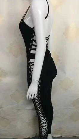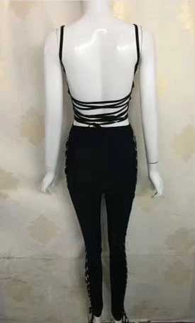 This sexy jumpsuit features thin straps, lace up sides, and an open strappy back. Wear this as the weather gets warmer with open toe pumps and your hair slicked back.