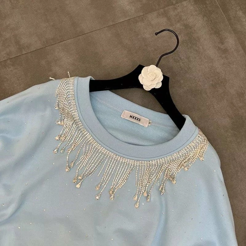 Lounge like a babe. This two piece set features a long sleeve sweatshirt with crystal fringe details and matching shorts with two pockets. Pair with chunky socks and slippers for a girls night in!