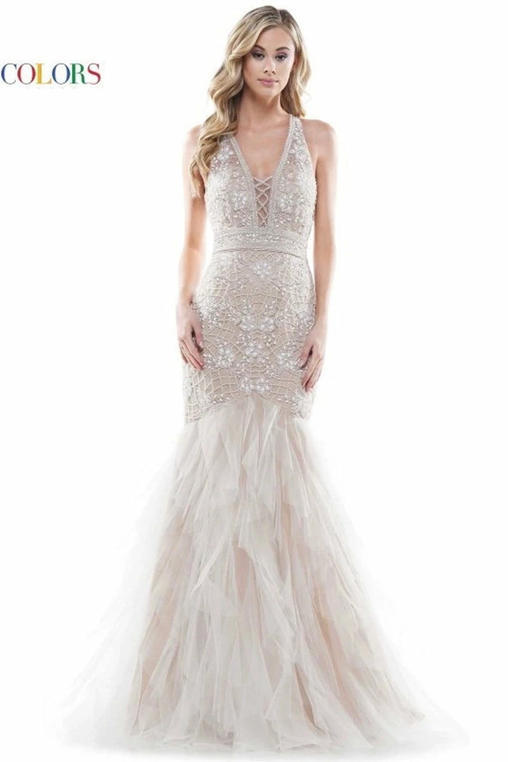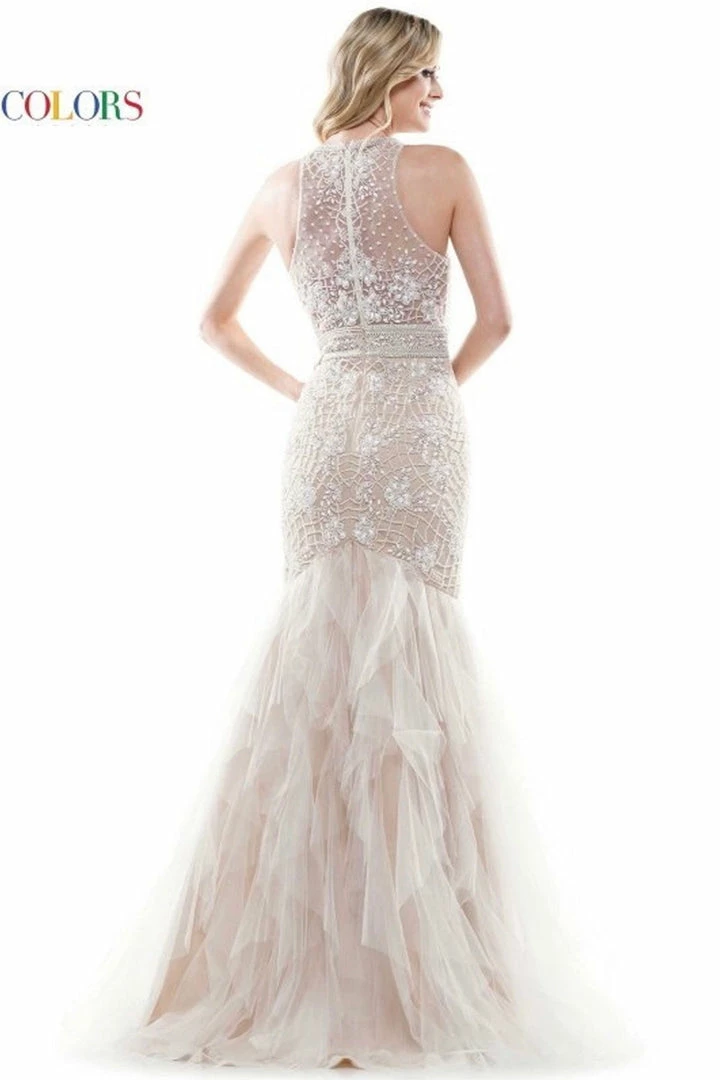 47″beaded mesh prom dress with mesh ruffle skirt.Sheer back with mermaid silhouette