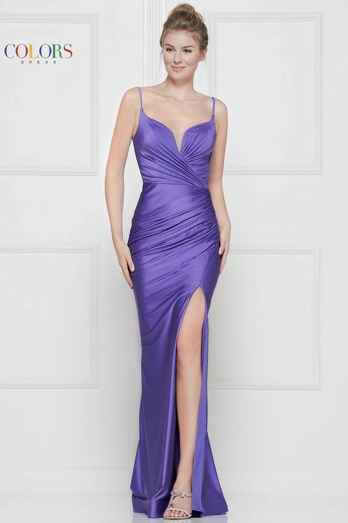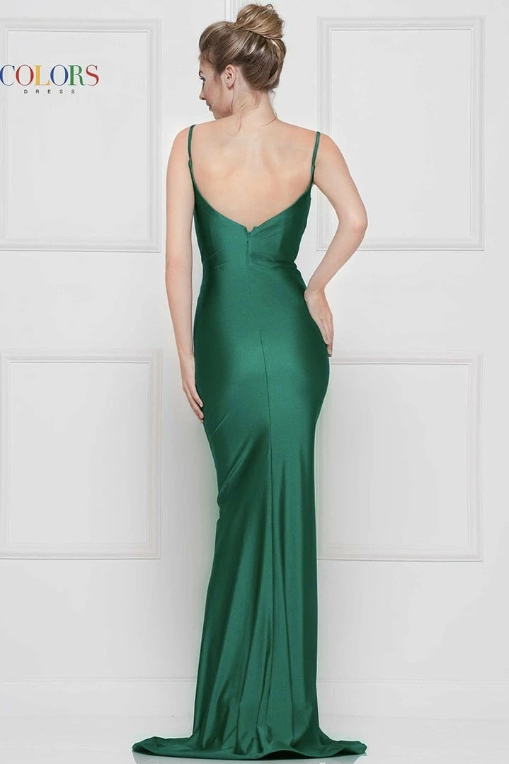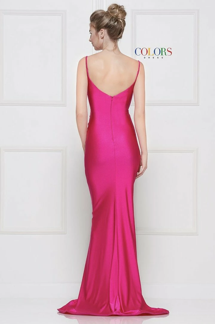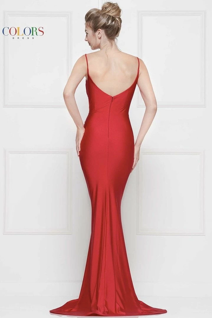 Expect to be turning heads as you walk into your special event wearing this simple yet sophisticated stunner by Colors Dress 2032. The fitted bodice offers a plunging sweetheart neckline adorned with sheer inset detail. Spaghetti straps support the bodice as it leads to the mid-open back. The skirt flares elegantly from mid-thighs to floor length highlighting a trumpet silhouette. Finishing the look of this ensemble is the sweep train that adds the dramatic touch. Flaunt your figure in this fabulous Colors Dress creation. Model is wearing Black color.