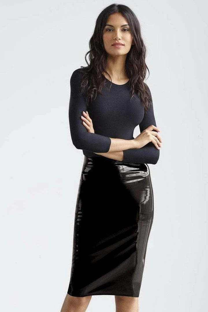 Our faux patent leather midi skirt is so chic and fabulously firming. We designed this to-die-for women’s skirt with our signature internal waistband and faux patent fabric for a smoothing, sleek look, that will make for a memorable night out!