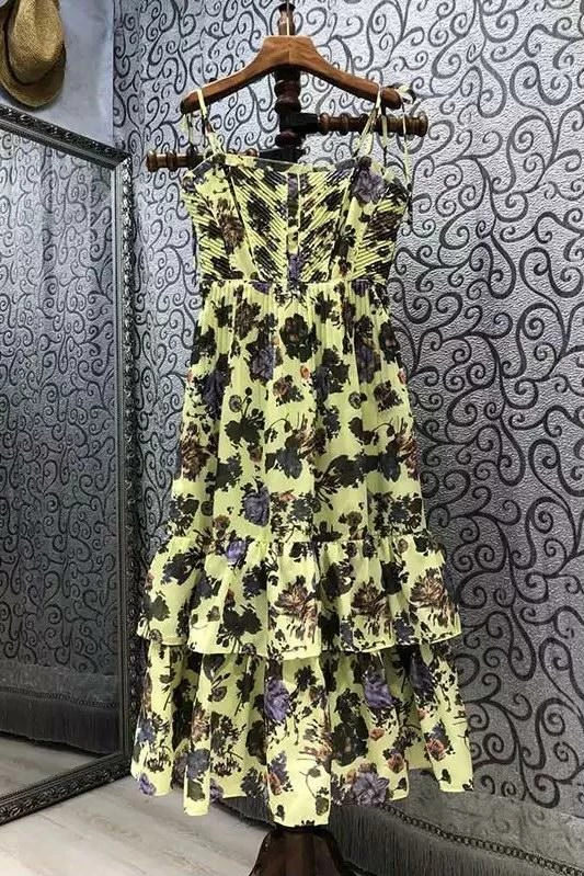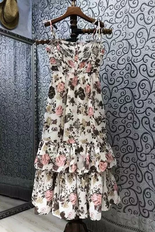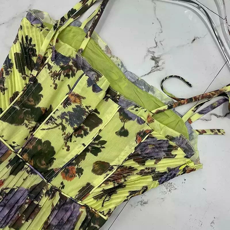 The perfect sundress for the season featuring pleated detailing to accuntate your body, thin straps with bows, and a ruffle hem. Pairs perfect with a hat and tote bag for a gorgeous summer day.