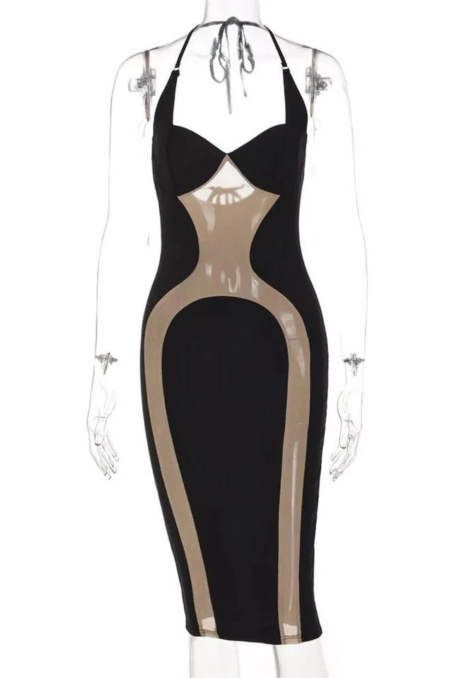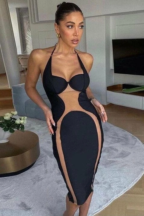 Show off that body this season! Featuring a bodycon mini dress with mesh details outlining your curves and a halter neck style that can be worn multiple ways. Style with gold bangles, mini hoop earrings, and ankle strap heels to hit the club looking hot!