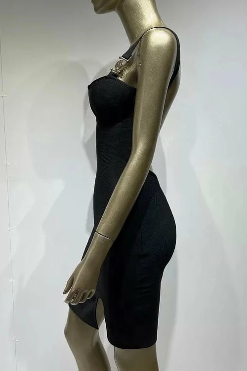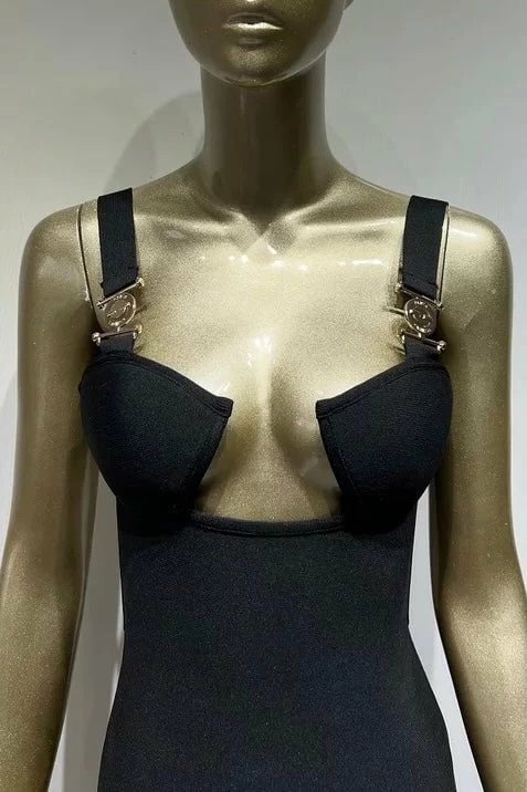 Can’t go wrong in a little black dress! This staple style features thin straps with a gold buckle detail, an open triangle bust, bandage material, an open back, and a slight leg slit. Style with simple gold jewelry and a pop of color pump for a dinner to drinks look!