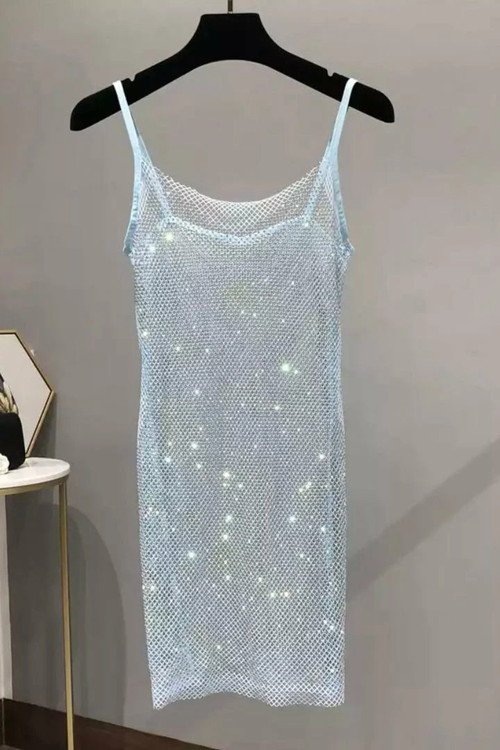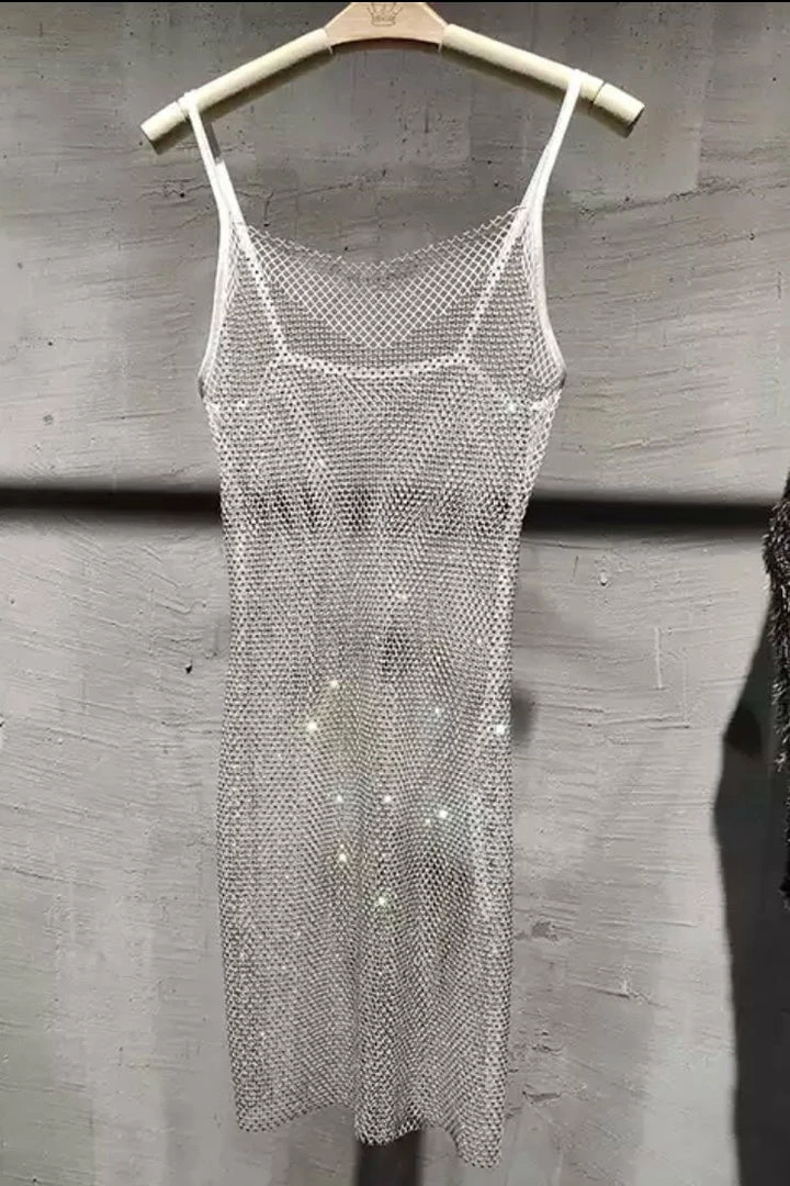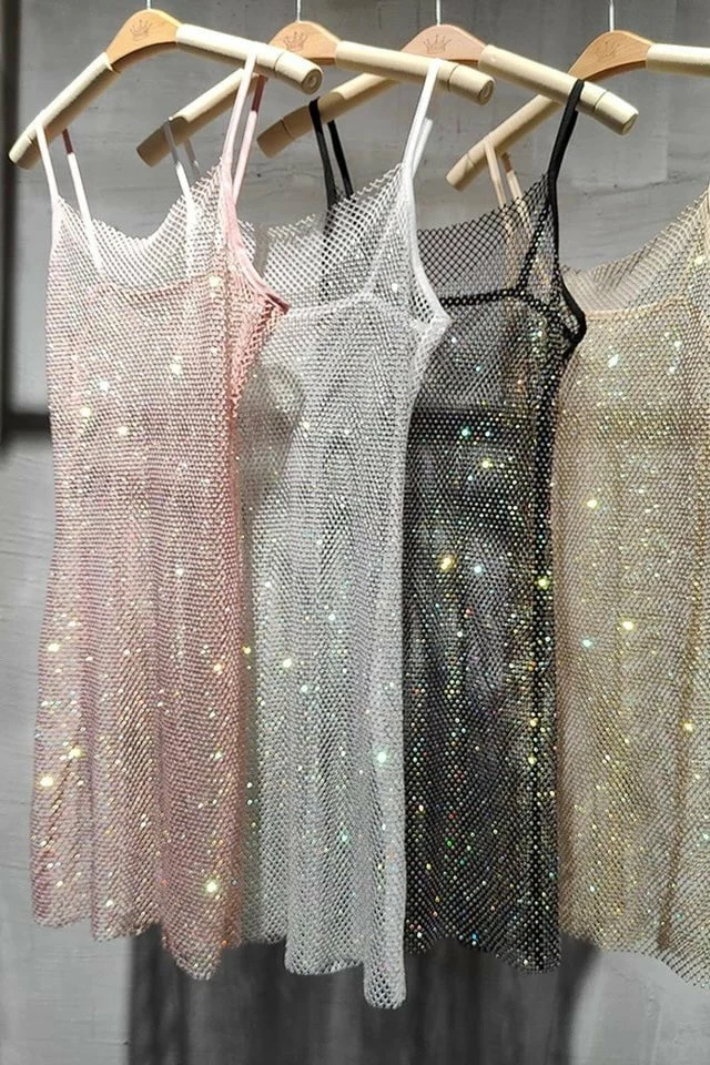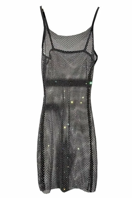 Look gorgeous in this mini. Featuring a bodycon fit, thin straps, and a sheer mesh material covered in rhinestones. Pair with a slip or wear it as a sexy cover up!