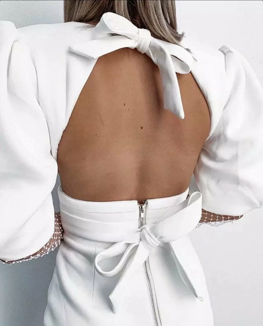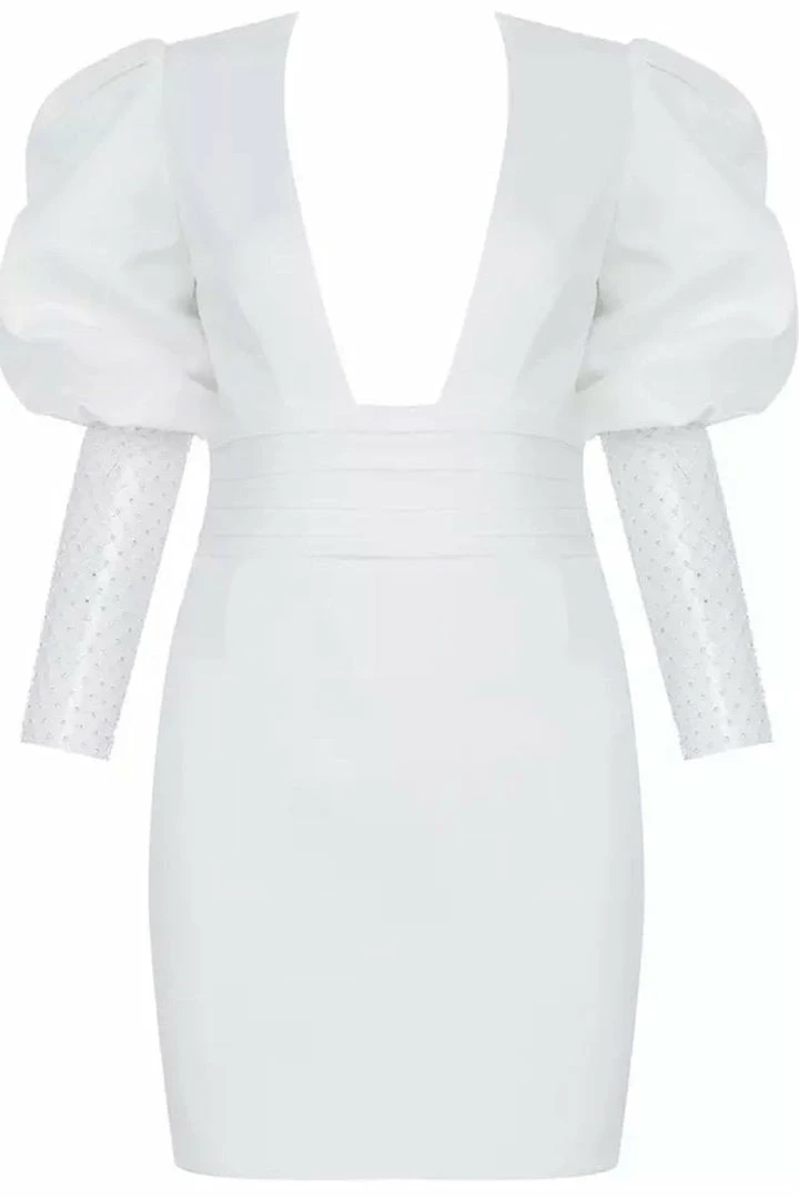 This mini dress features a tie neck and belt with a plunging neckline. Also accompanied by puffed shoulders and mesh rhinestone sleeves, this dress is perfect for transitioning to the warmer weather! Either in black or white, this piece is sure to become a going out staple.