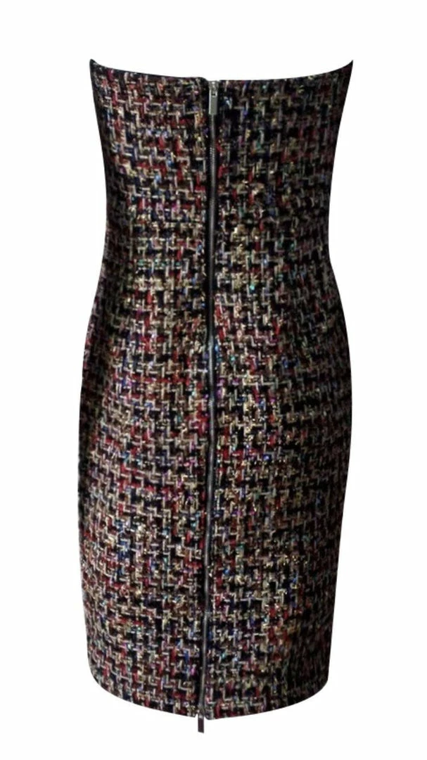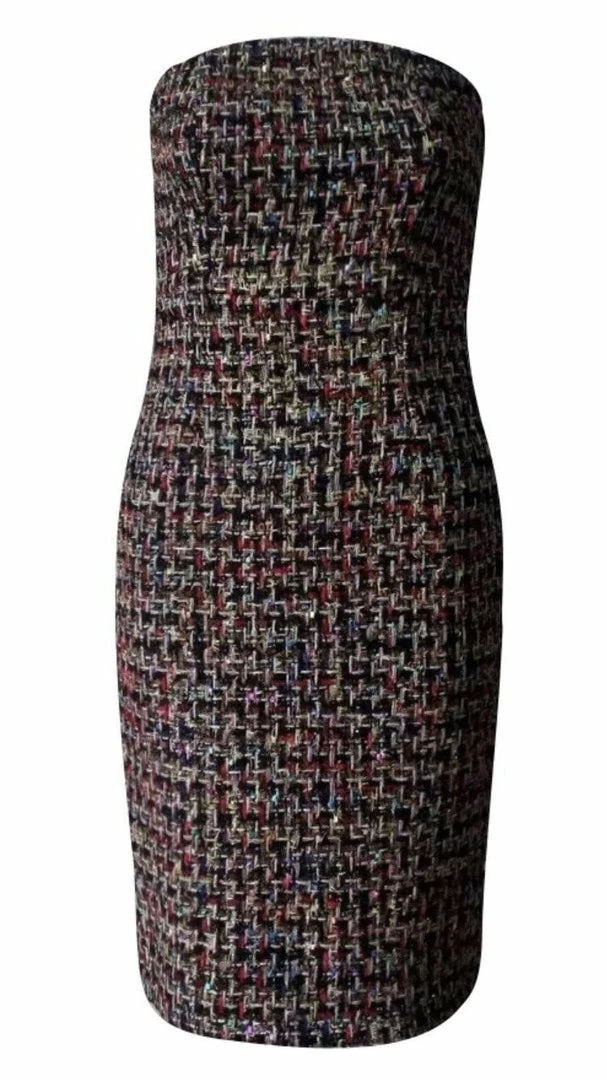 Look classy yet super trendy with our ‘Sandy’ dress! Featuring a tweed material, strapless style, bodycon fit, and midi length.