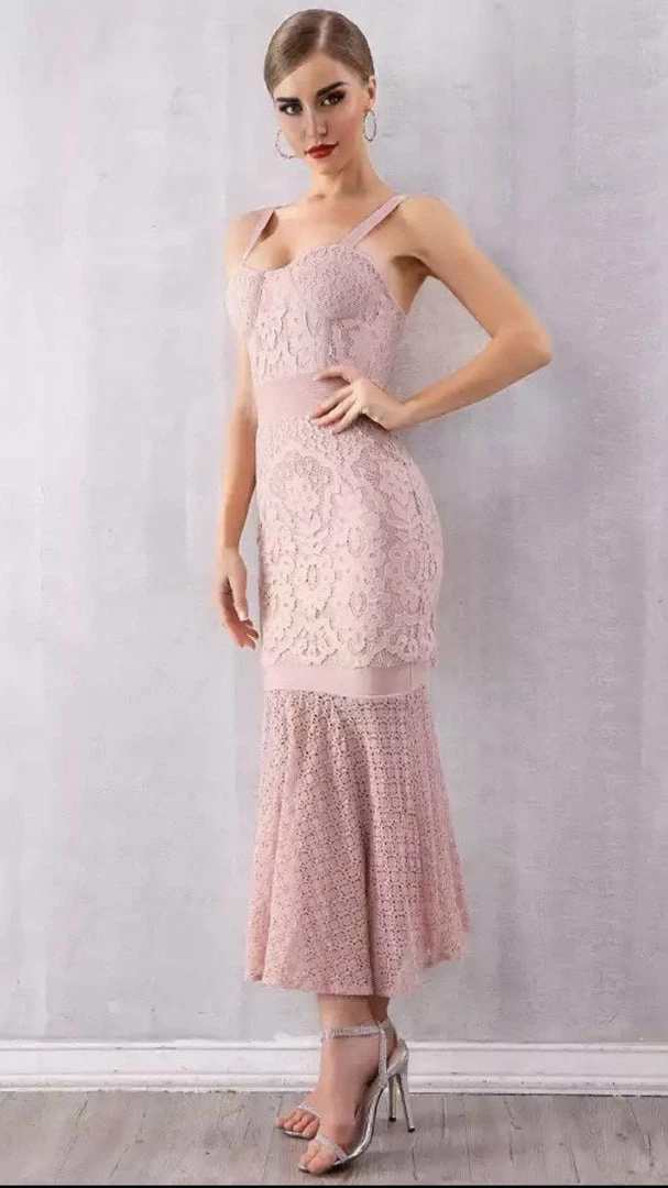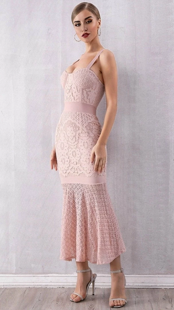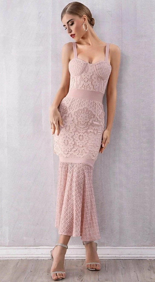 Get this dusty pink piece for your occasion wardrobe. Featuring a pink material, lace and sheer details, spaghetti straps, and a midi length. Pair with strappy heels.