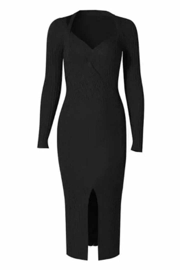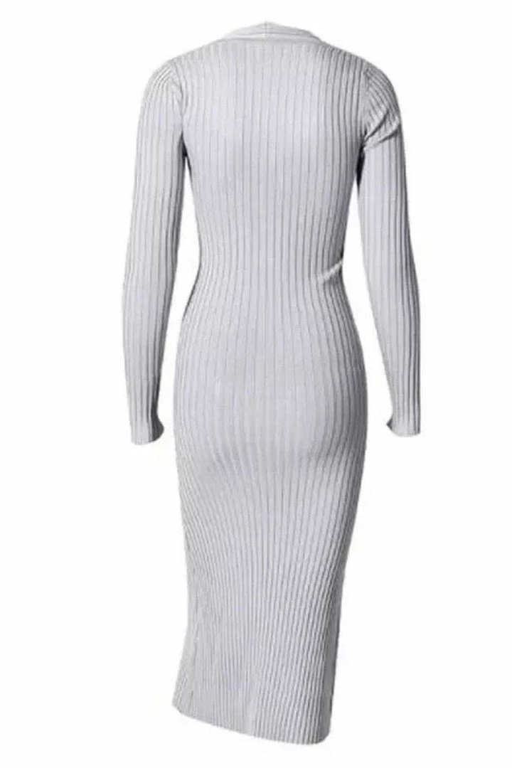 This long sleeve midi dress features a center slit at the legs and a v-neck with small cutouts at the high neck. Pair with your favorite chunky white sneakers for an effortless look or strappy heels for a going out look.