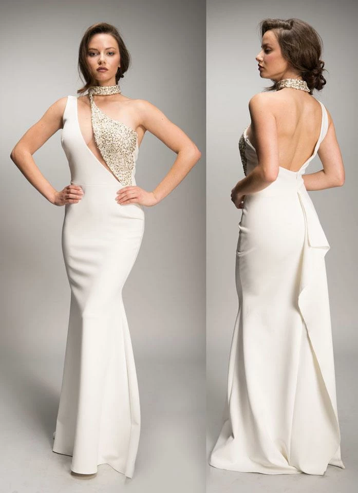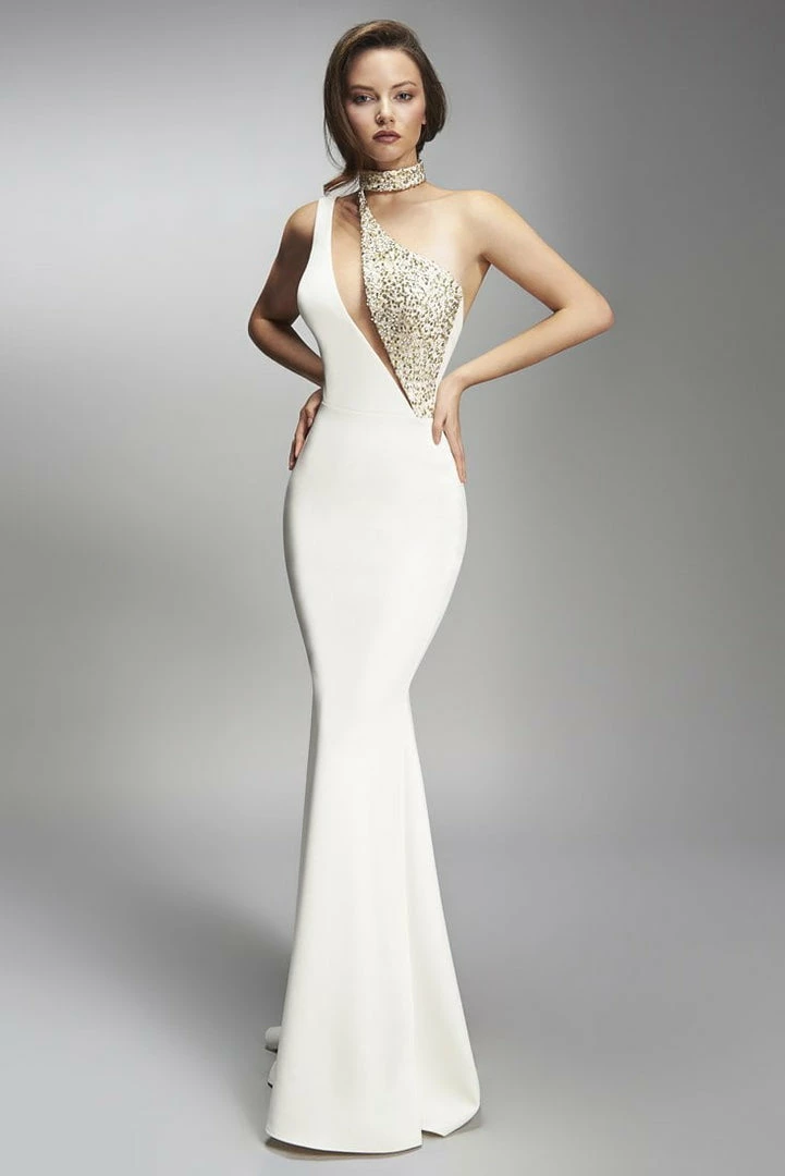 This cocktail dress features a unique asymmetrical print silhouette, cutouts with mesh insert, a semi leg slit, and high neck.