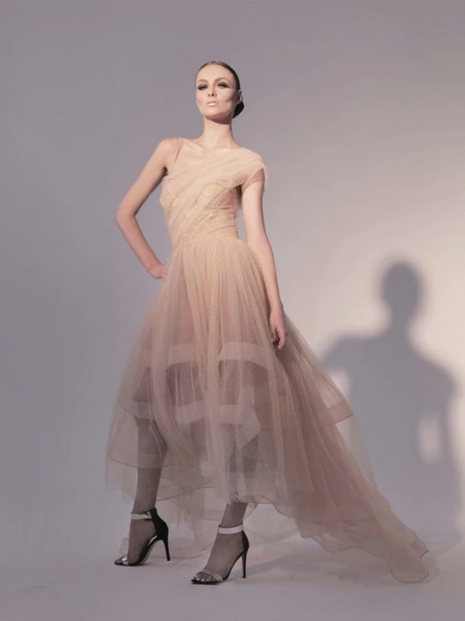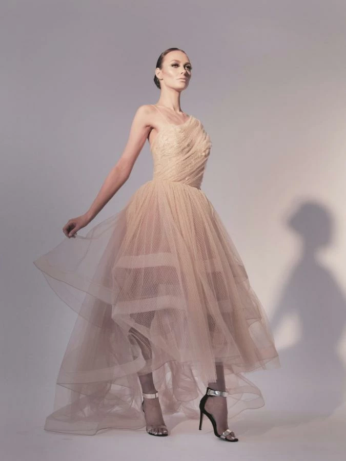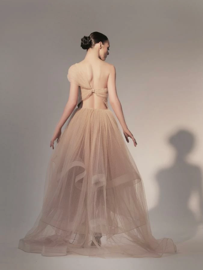 This romantic tulle evening gown features a one shoulder neckline and a high low length creating a layered look.