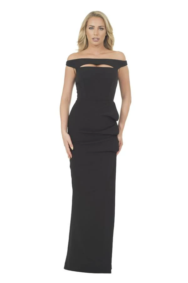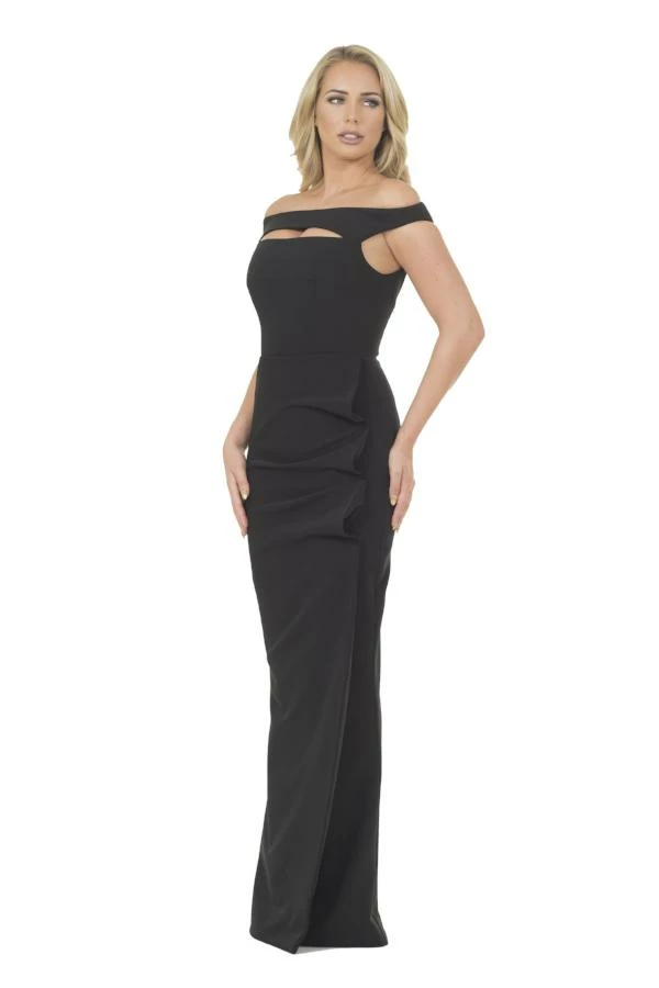 This floor length gown features a cutout in the bust and off the shoulder sleeves witha ruffle accent down the front.