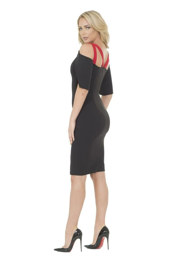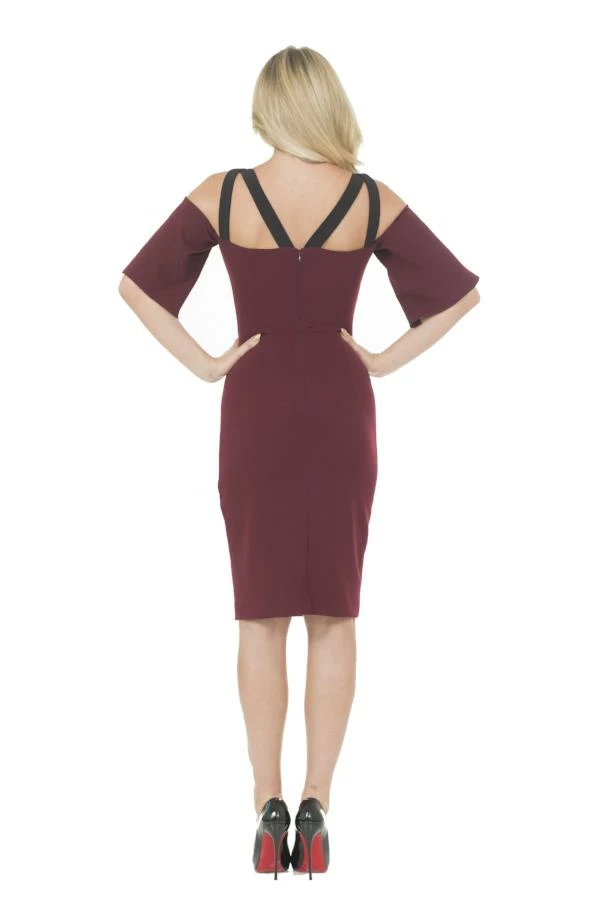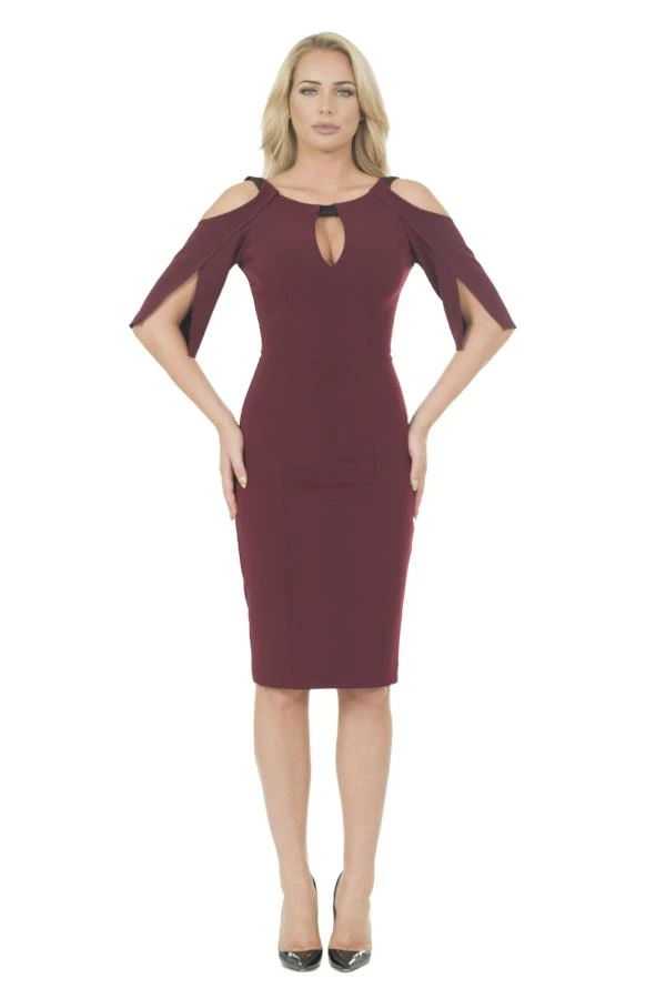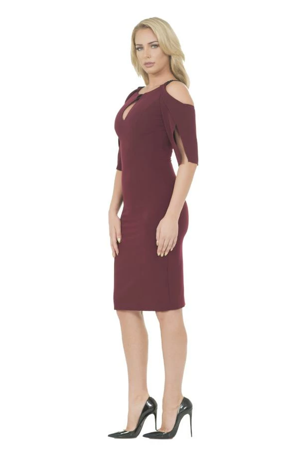 This cocktail length dress with a keyhole in the front and open shoulder sleeves with cutouts in the back and down the sleeve.