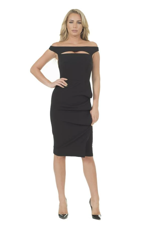 This cocktail length dress features a cutout along the bust and off the shoulder sleeves with ruching in the front.