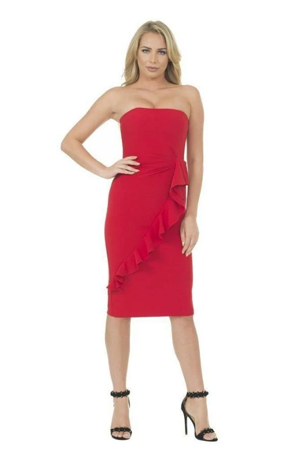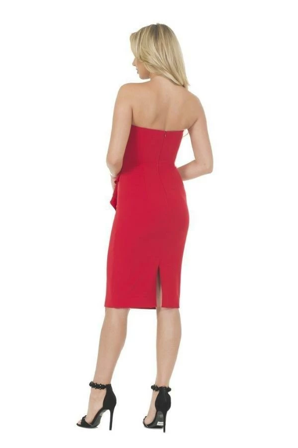 Strapless cocktail dress with ruffle detail down the front and wrap waist with a back slit.