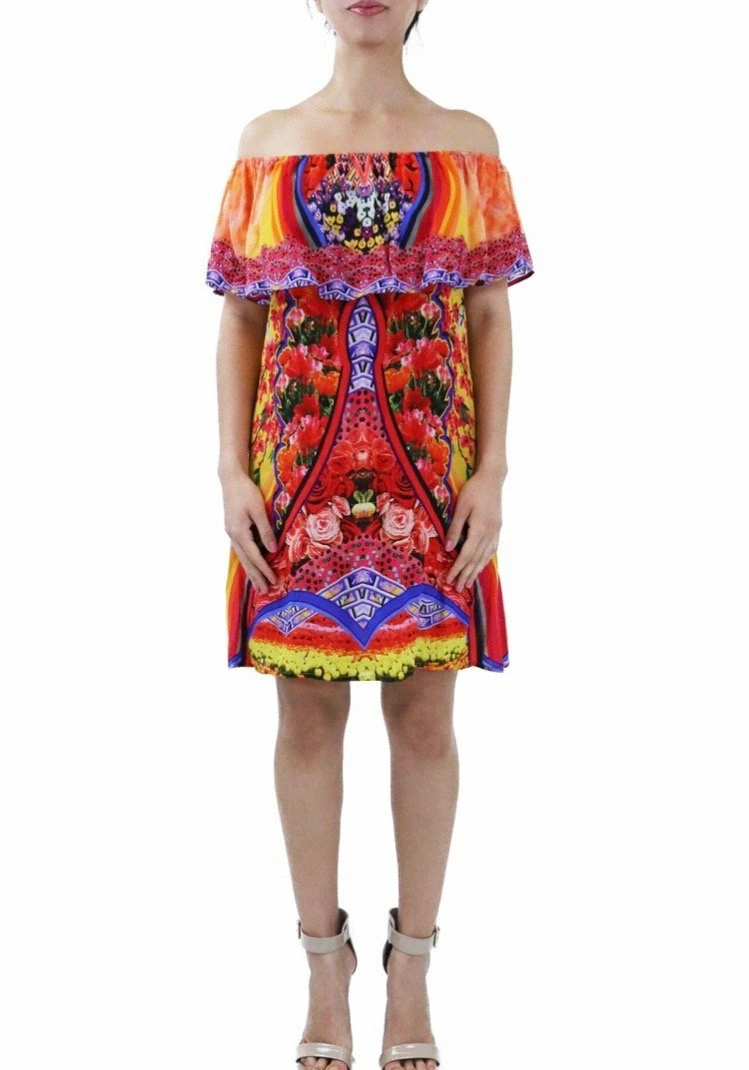 Shahida Parides Off The Shoulder Floral Rainbow Print Short Ruffle Dress