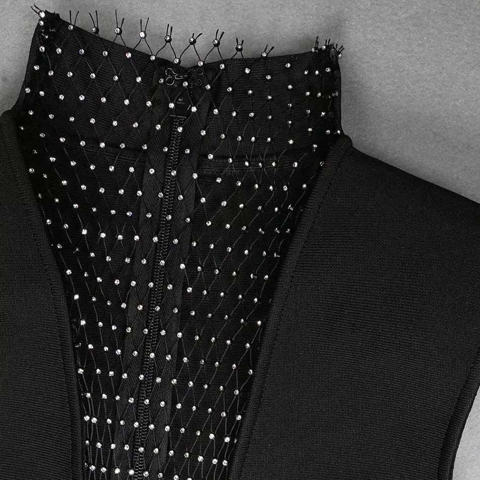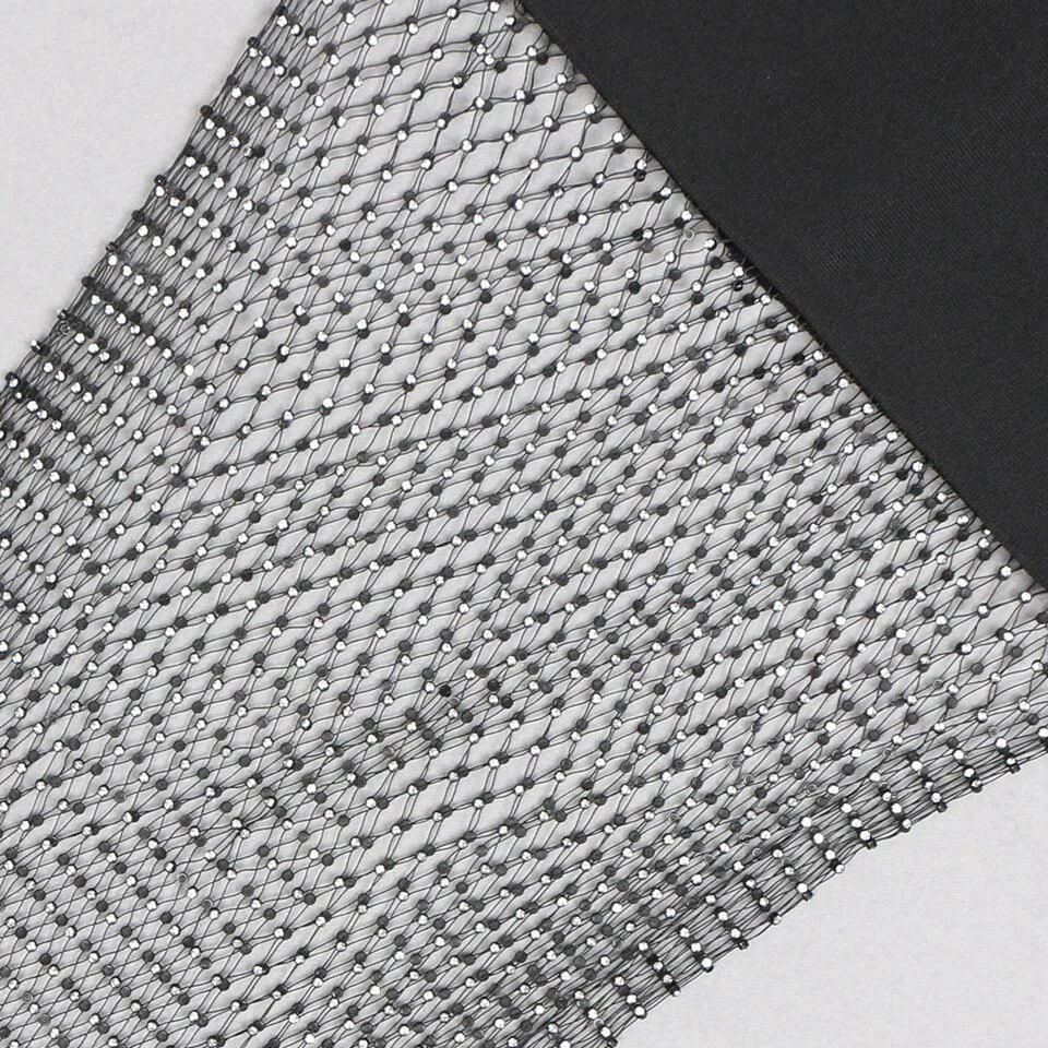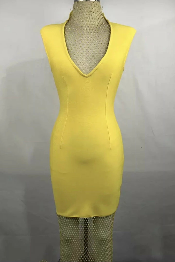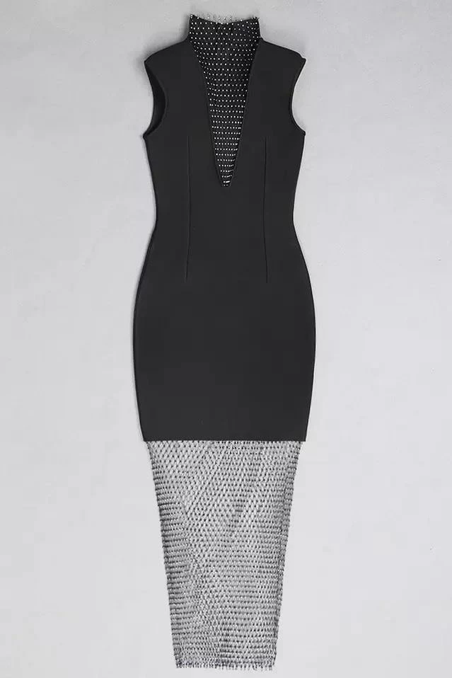 Steal all the stares in this sleeveless bodycon dress featuring a diamond mesh high neckline, a bandage material, a deep v neck, and a sheer diamond mesh midi skirt. Pair with clear heels and a small hand bag to let the dress be the statement piece.