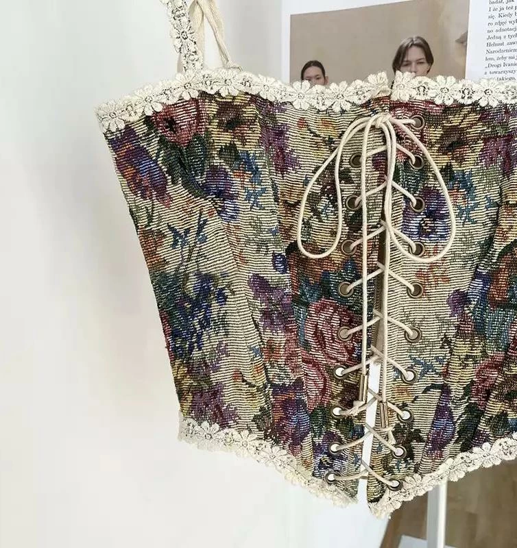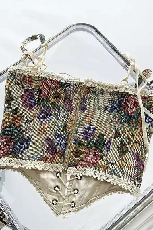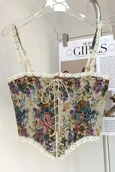 This top belongs on a balcony in Paris. Featuring a sleeveless coset top with a floral printed pattern, an enchanting flower lace detailing along the hems and straps, and lace up binding in the center. Style with a mini skirt or jeans and heels for a dreamy look the dolls will love!