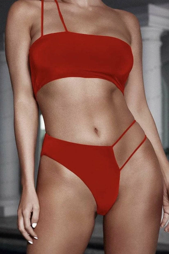 Achieve the effortless yet sexy look at your next poolside event. This set features a one shoulder bikini top with matching bottoms and cut out details. Pair with a printed kimono and sandals for a totally cute look.