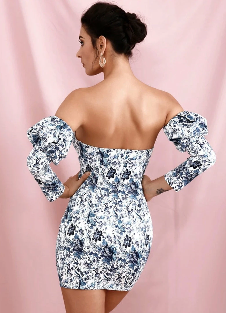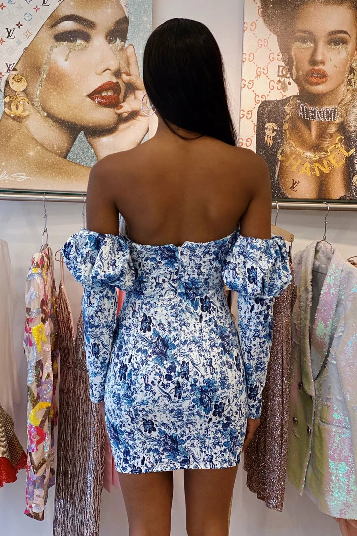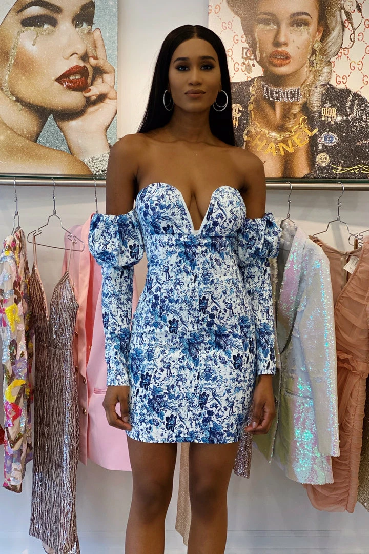 Both elegant yet sexy, our ‘Bonita’ dress will have everyone’s eyes on you! Featuring a stunning white and blue floral pattern, off the shoulder style, deep v-neck, bodycon fit, and mini length. Pair with a conductor hat and thigh high boots for a trendy daytime look.