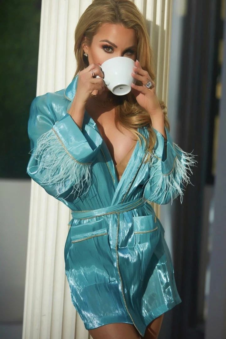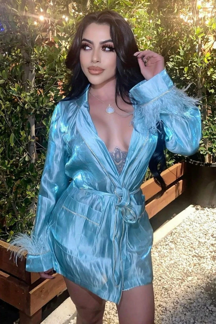 The ‘Chelsia’ dress gives us such sophisticated yet sassy vibes! Featuring long sleeves, v-neck style, feather embellishments, belted waist, and mini length. Pair with gold heels and tousled waves for a night out.