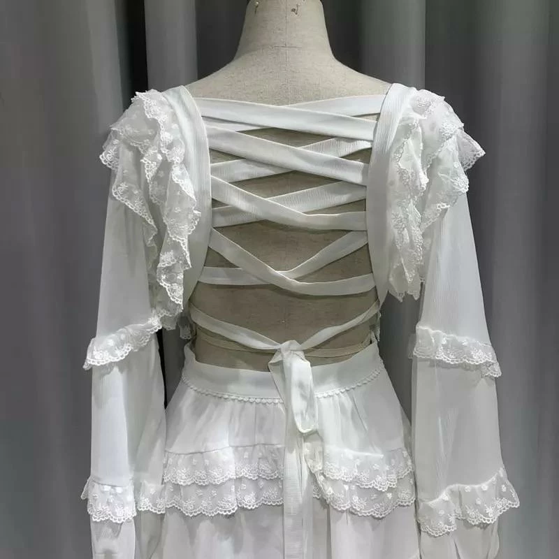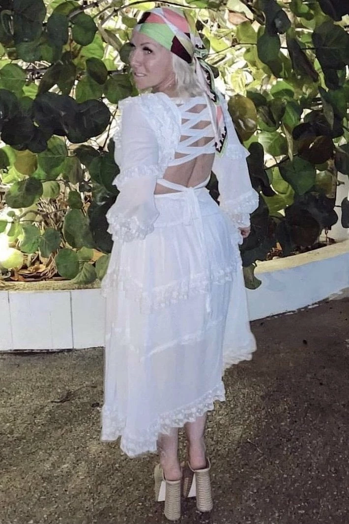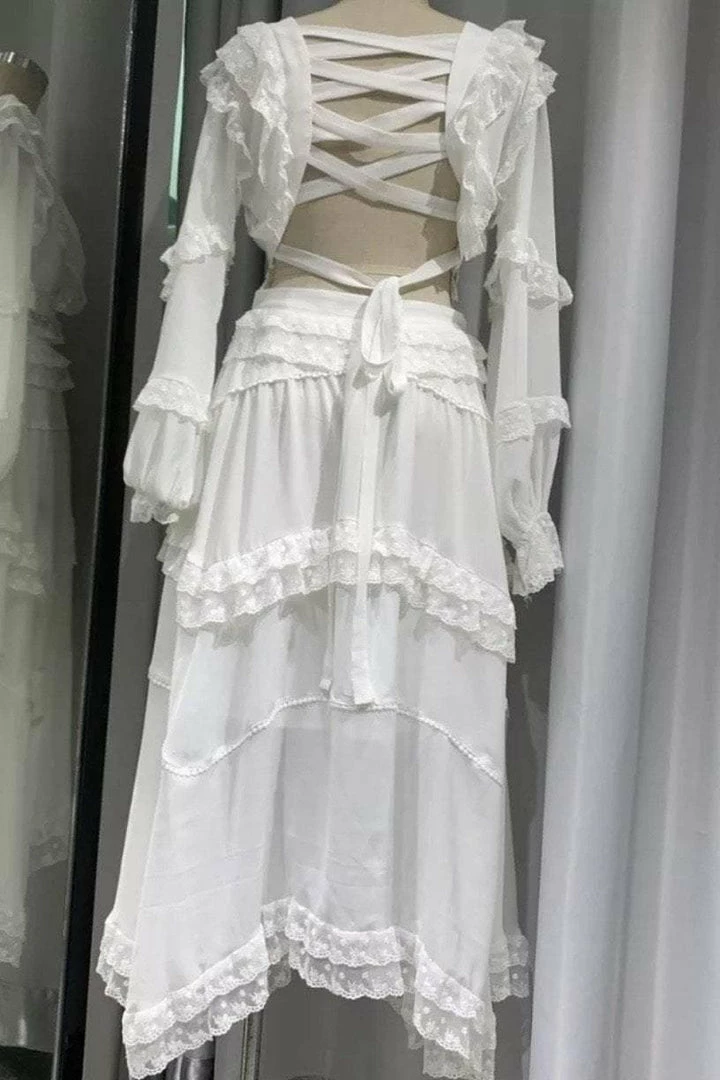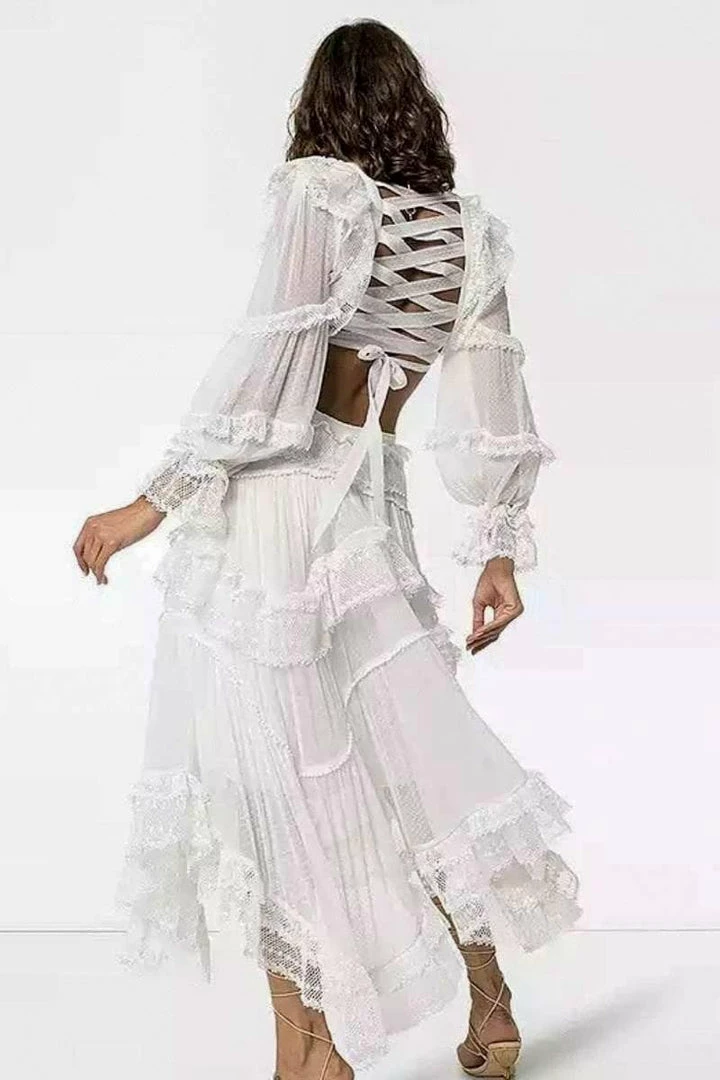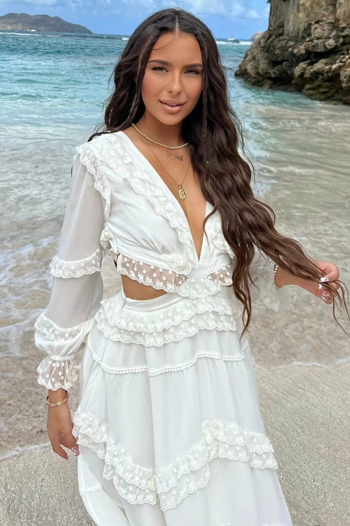 We are drooling over the details of this stunning maxi! Featuring long sleeves, lace-up back, waist cut-outs, v-neck detail, ruffles all over, and a maxi length. Pair with nude heels and a summer glow to complete the look.