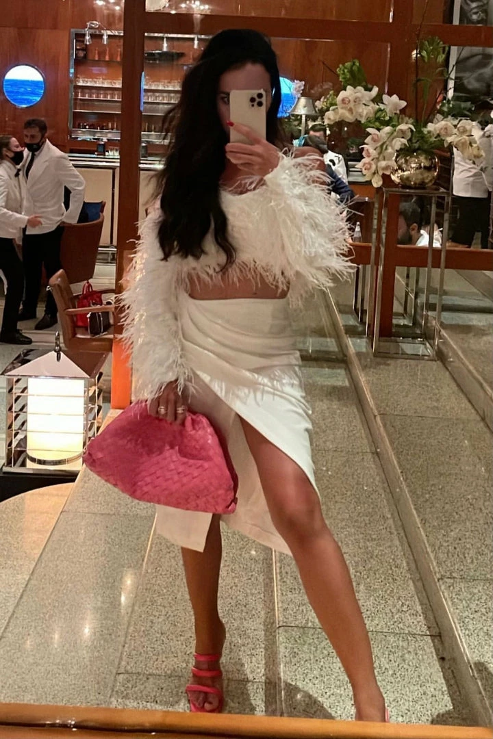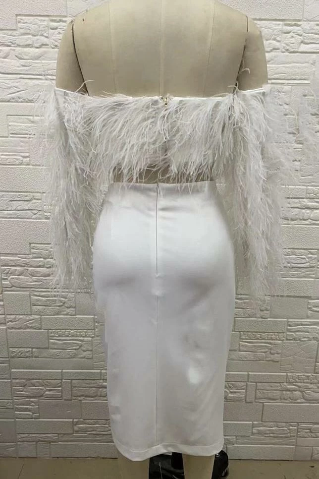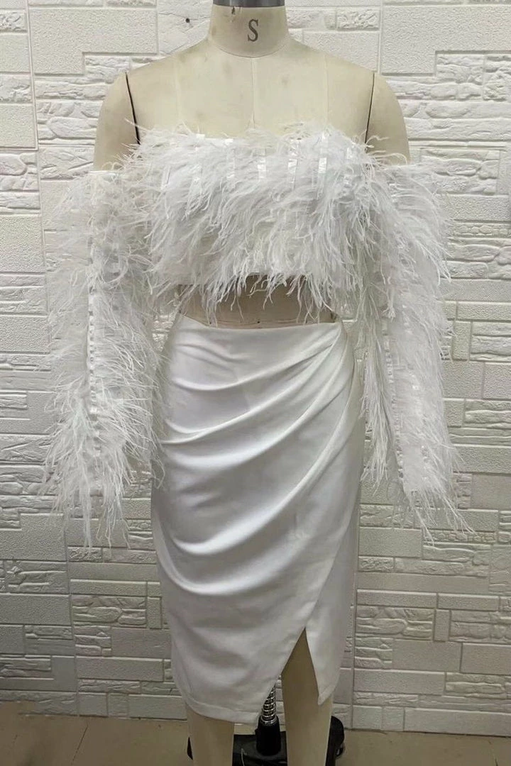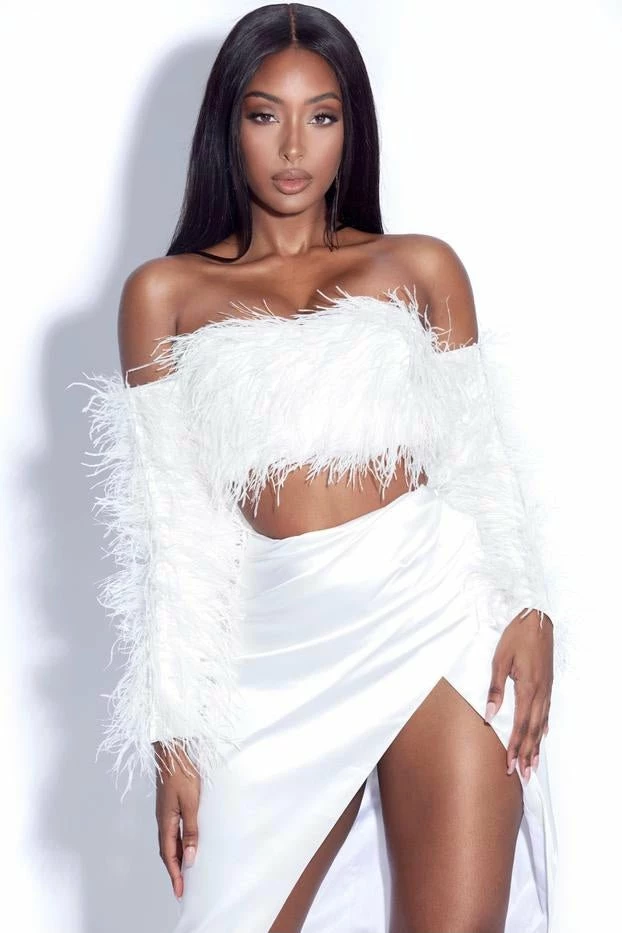 Feathers are our favorite accessories of the season! This glamorous two piece set features a long sleeve, off the shoulder, fully feathered top with a cropped fitting and a high waisted ruched knee high skirt with a slight leg slit where the skirt wraps together. Add a colorful clutch and ankle strap heels for a look that’s giving us main character energy!