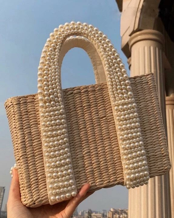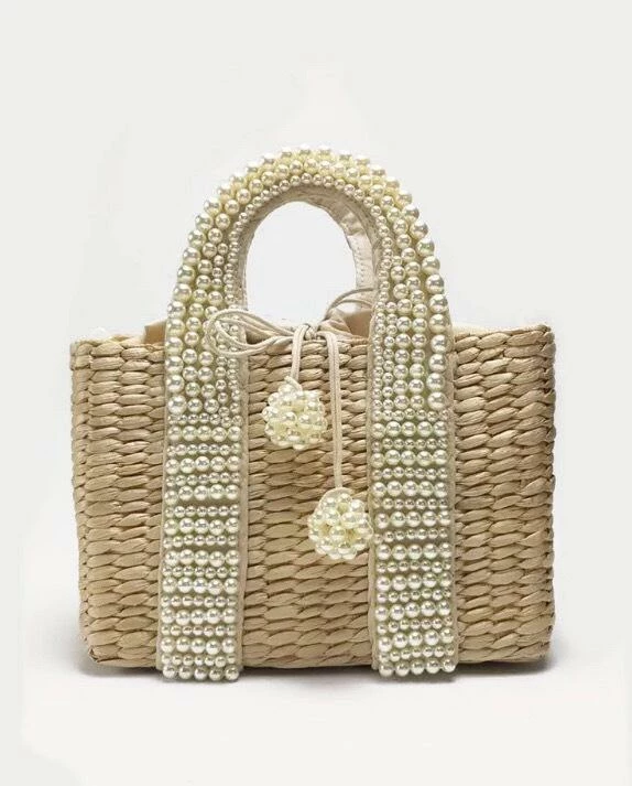 Look super chic in our ‘Erina’ tote bag. Featuring a straw material, tote style, crossbody strap, and pearl embellishments.