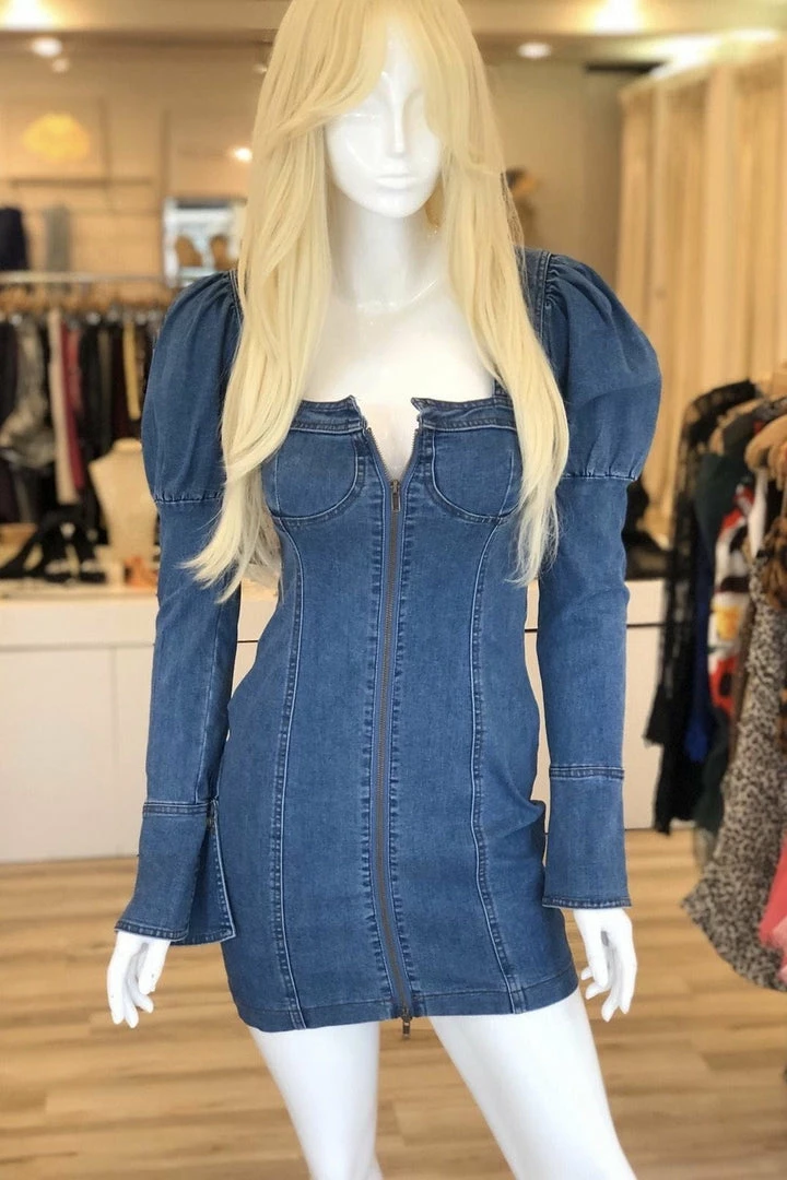 Your new day into nighttime dress! Featuring a denim material, puff shoulders, long sleeves, exposed zipper closure down the front, bodycon fit, and a mini length. Pair with wedges and summer waves!
