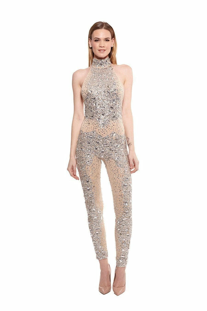 The Gaga jumpsuit comes in nude and features silver metallic stones and sequins throughout, fitted romper silhouette, and nude lining.The nude mesh has a lot of stretch in it and hugs the body like a glove. Perfect fit for curvier body types.