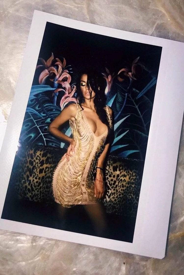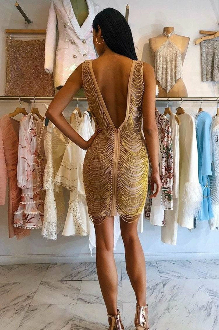 The ‘Gianna’ dress is a mini that gets all the love! With a deep v-neck, fringe detail all over, gold material, and mini length. Pair with strappy heels for an extra sexy look.