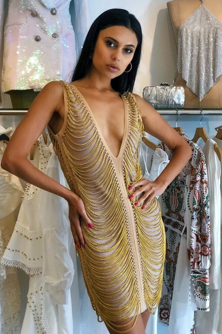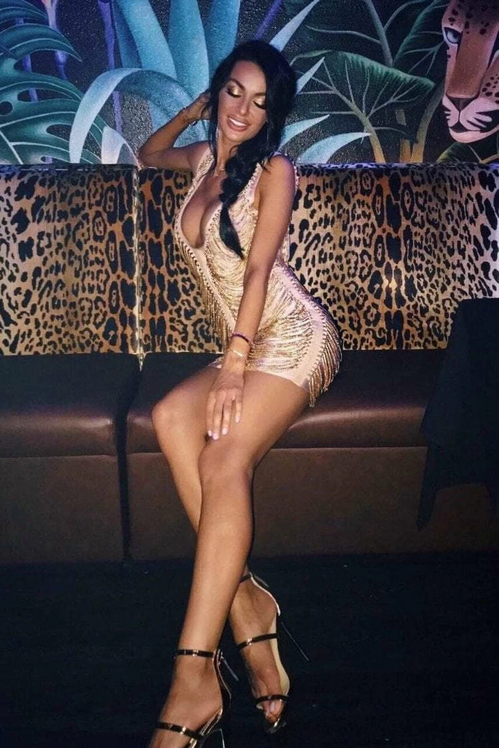 The ‘Gianna’ dress is a mini that gets all the love! With a deep v-neck, fringe detail all over, gold material, and mini length. Pair with strappy heels for an extra sexy look.